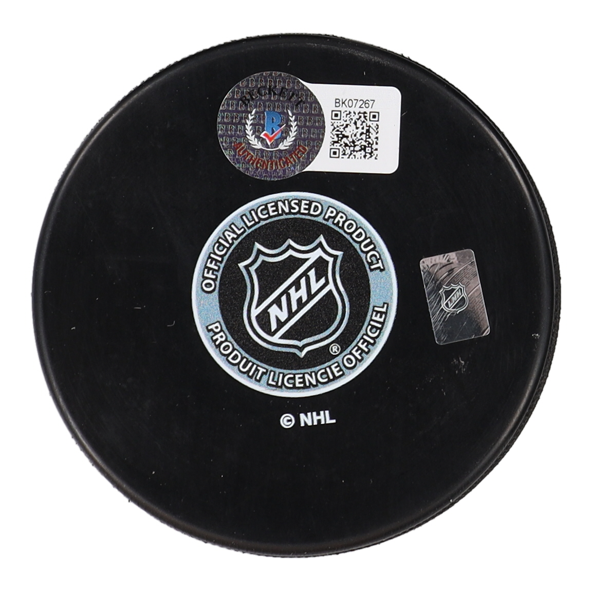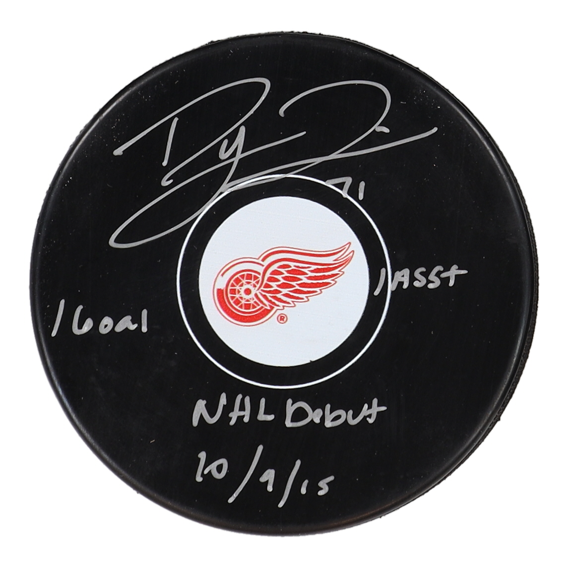 Dylan Larkin Signed Red Wings Logo Hockey Puck Inscribed "NHL Debut", "10/9/15", "1 Goal, 1 ASST" (Beckett)