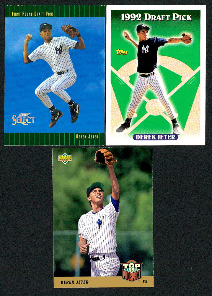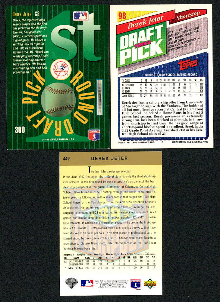 Lot of (3) Derek Jeter Baseball Cards with 1993 Topps #98 RC, 1993 Select #360 RC & 1993 Upper Deck #449 RC