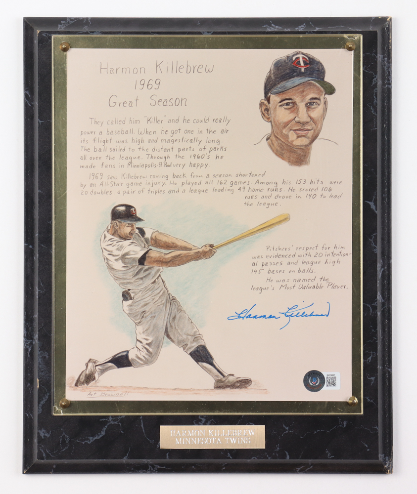 Plaque measures approximately 10" x 13" in size. Features a photo that has been hand-signed by Harmon Killebrew (D. 2011, Minnesota Twins, HOF). Please note the corners of the plaque are damaged.