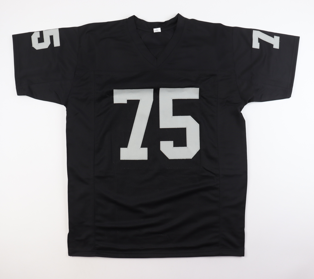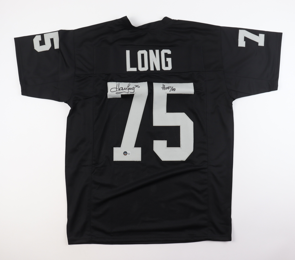Custom jersey with everything sewn on, size XL. Hand-signed and inscribed by Howie Long (HOF). Please note, there are stains on the reverse number.