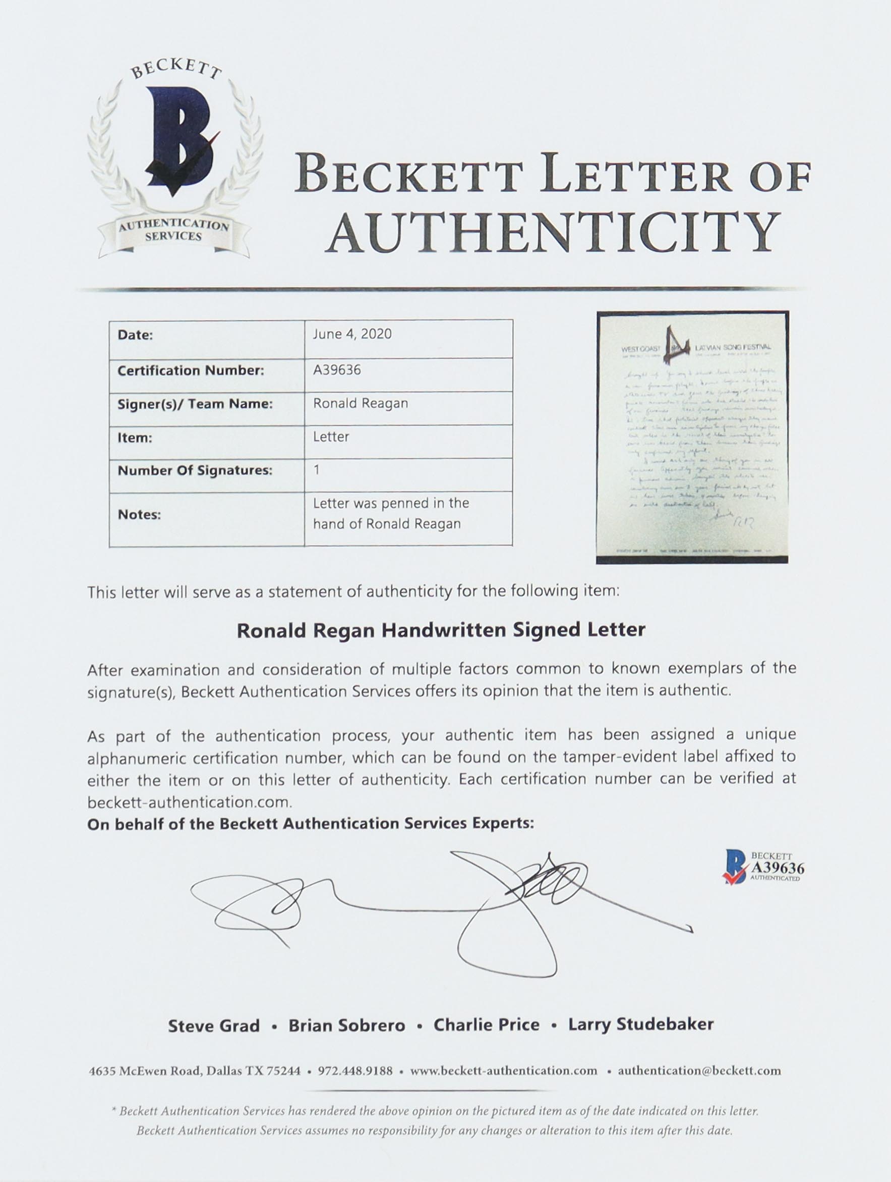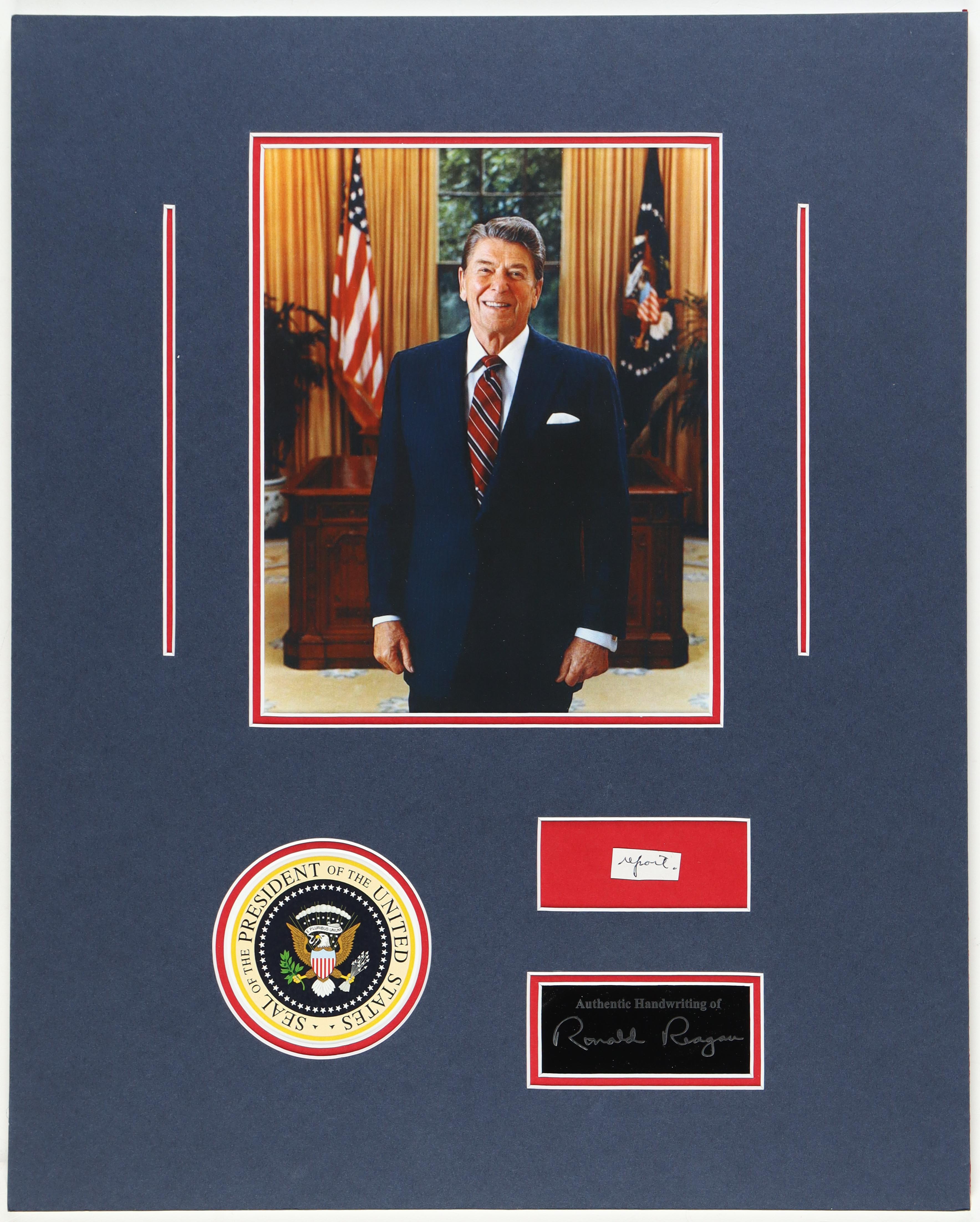 Custom matted display measures 16" x 20" in size and features a cut from a letter that had been hand-written by Ronald Reagan (D. 2004). Please note, Regan did not autograph the cut but he did write the word(s) that are featured on the cut.