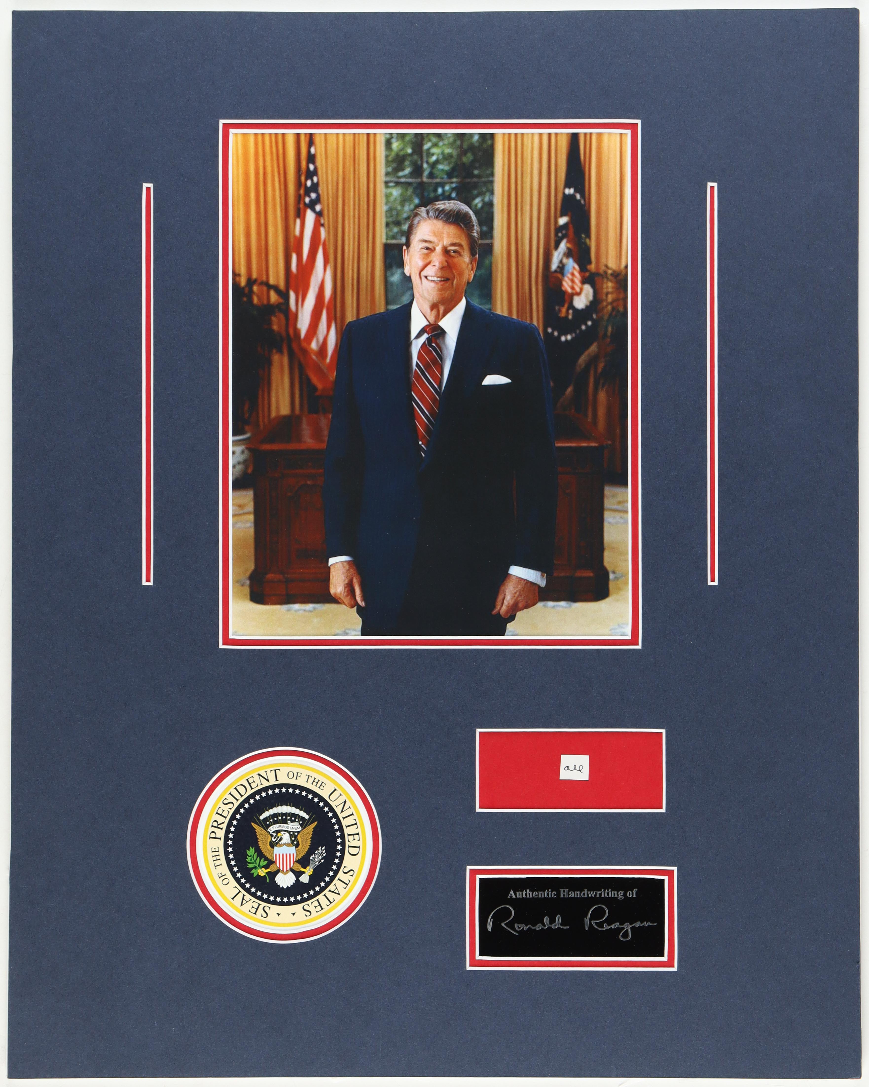 Custom matted display measures 16" x 20" in size and features a cut from a letter that had been hand-written by Ronald Reagan (D. 2004). Please note, Regan did not autograph the cut but he did write the word(s) that are featured on the cut.