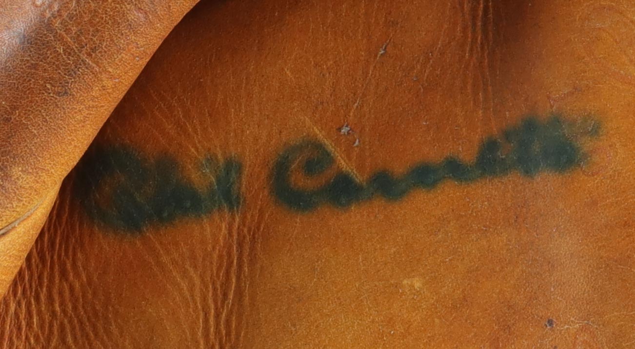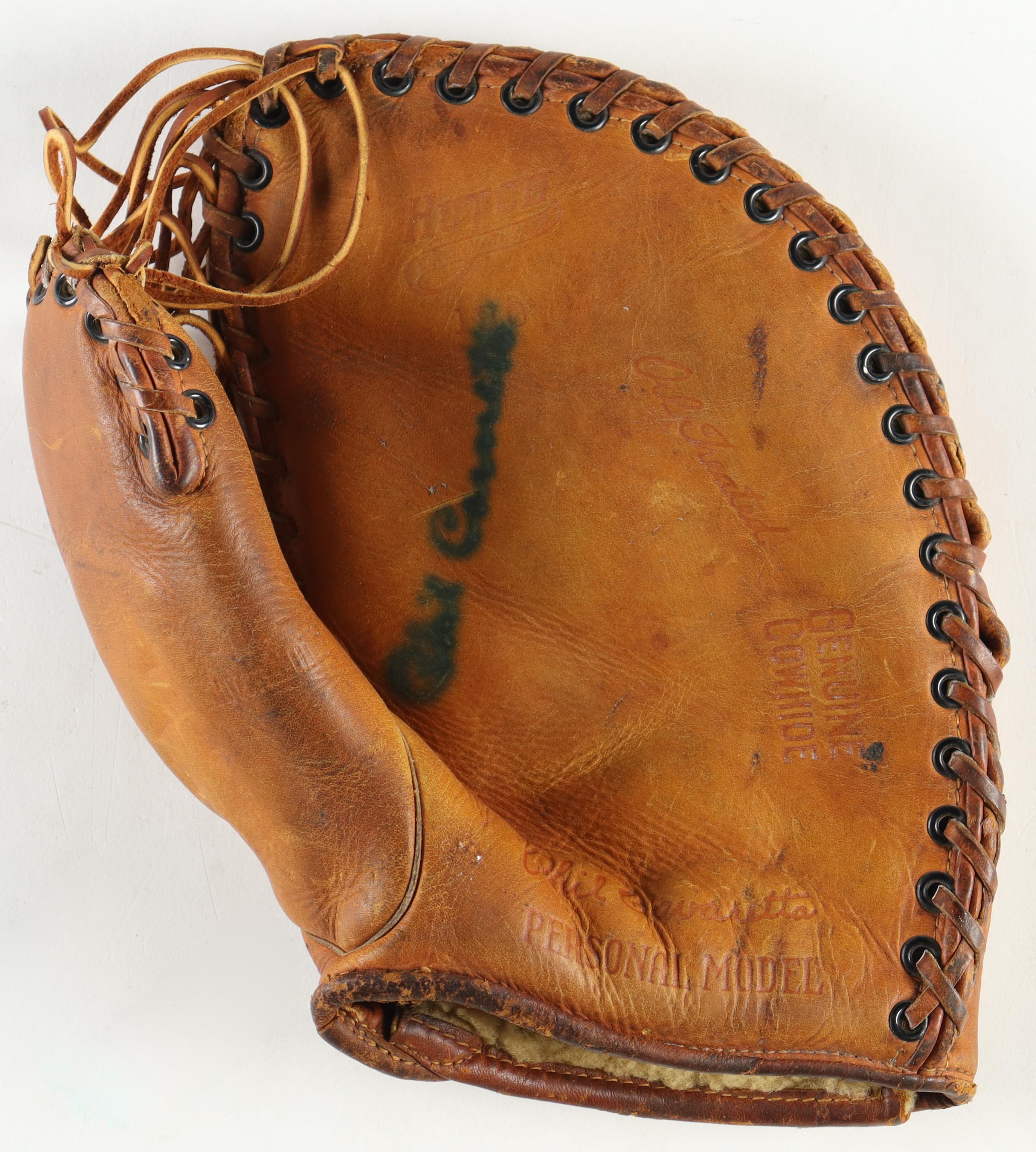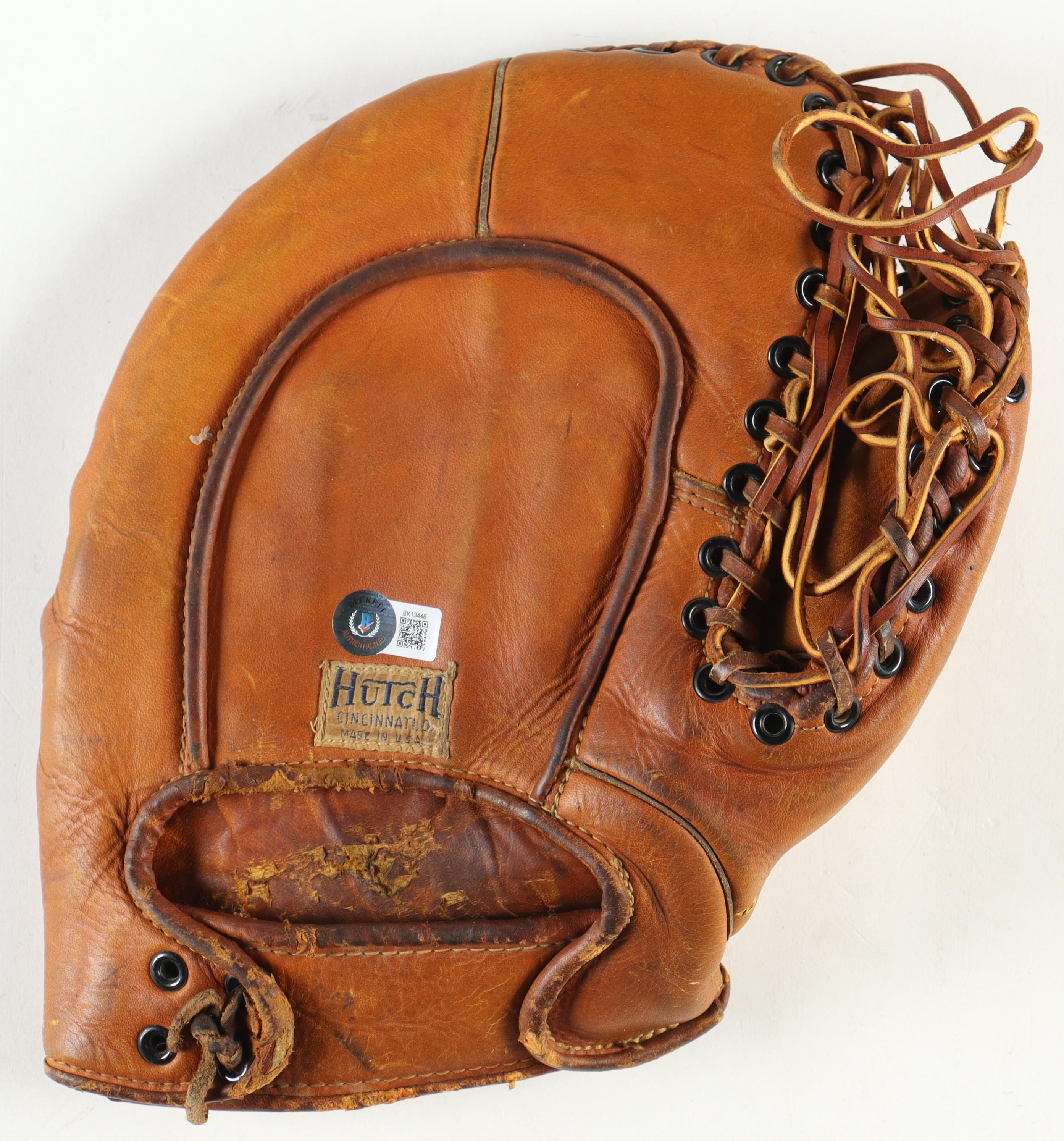 Vintage Hutch baseball glove. The glove has been hand-signed by Phil Cavarretta (D. 2010, Chicago Cubs). Please note, the glove shows signs of wear and aging and the autograph ink has bled.