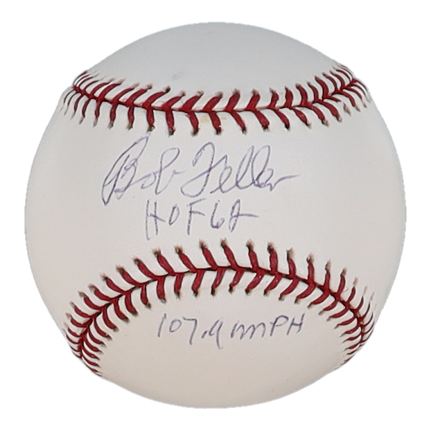 Bob Feller Signed OML Baseball Inscribed "HOF 62" "107.9 mph" (Beckett & Reggie Jackson)