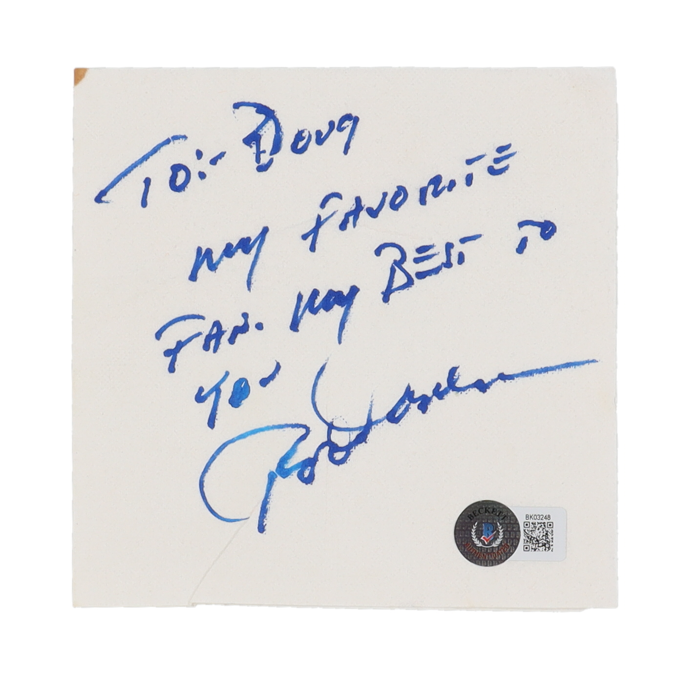 Napkin has been hand-signed and inscribed by Rod Carew (California Angels, HOF). Please note, this item has been personalized "To: Doug."