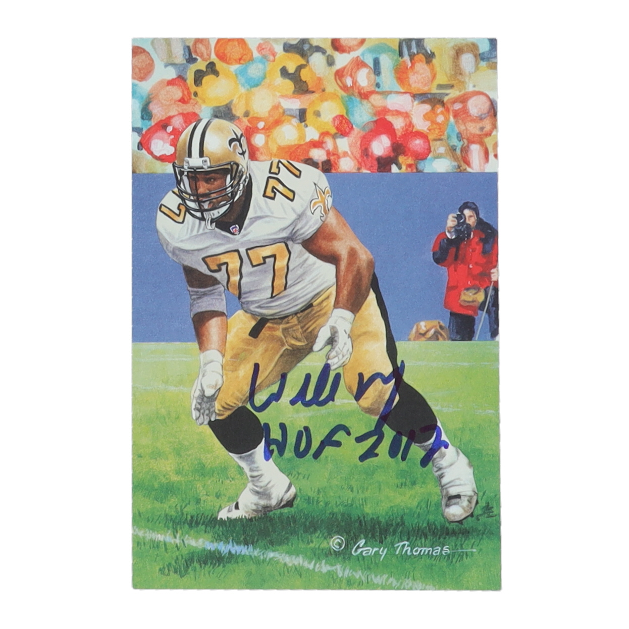 Card has been hand-signed and inscribed by Willie Roaf (New Orleans Saints, HOF). Please see photos for more details regarding the condition of the card.