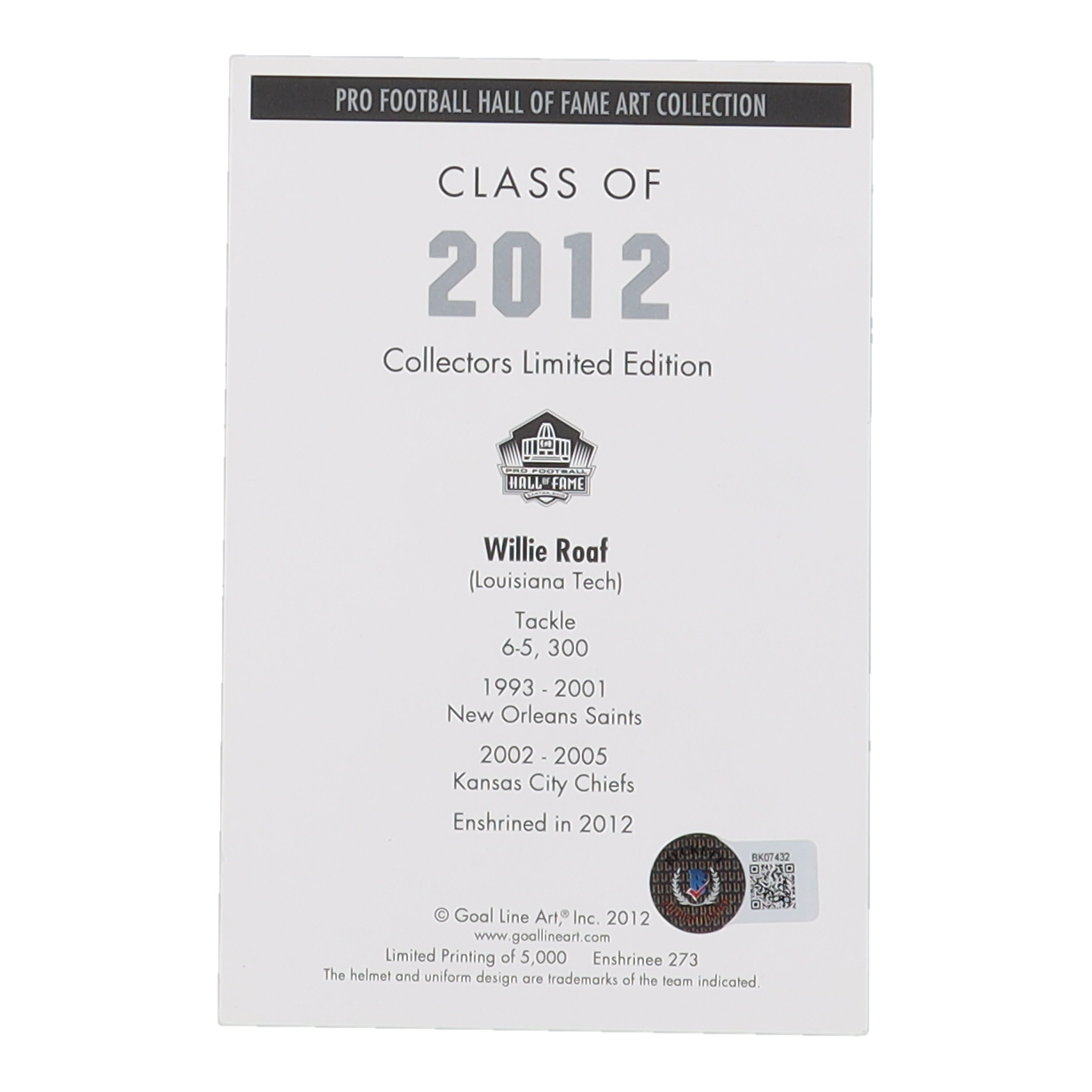 Willie Roaf Signed 2012 Goal Line HOF #6 Inscribed "HOF 2012" (Beckett)