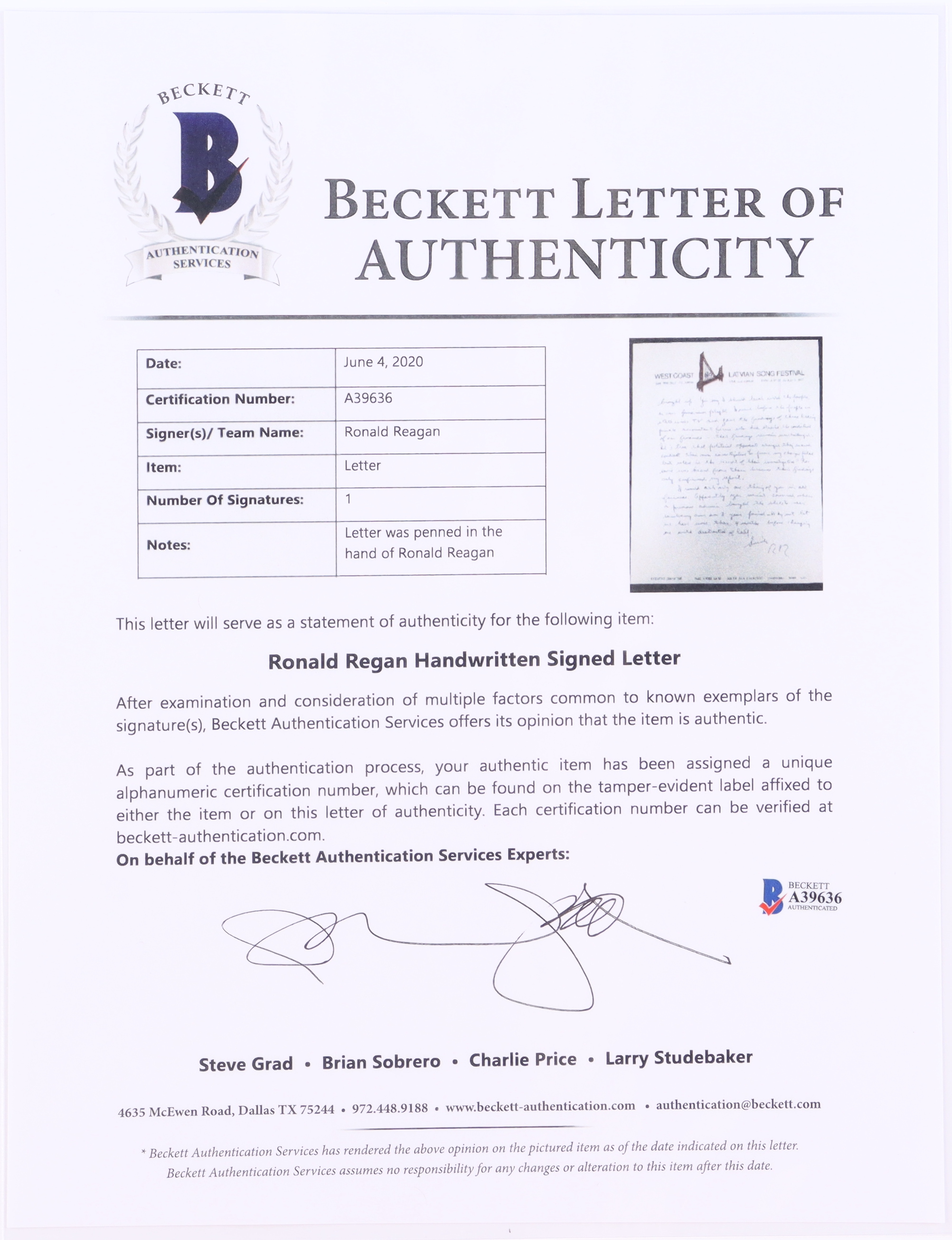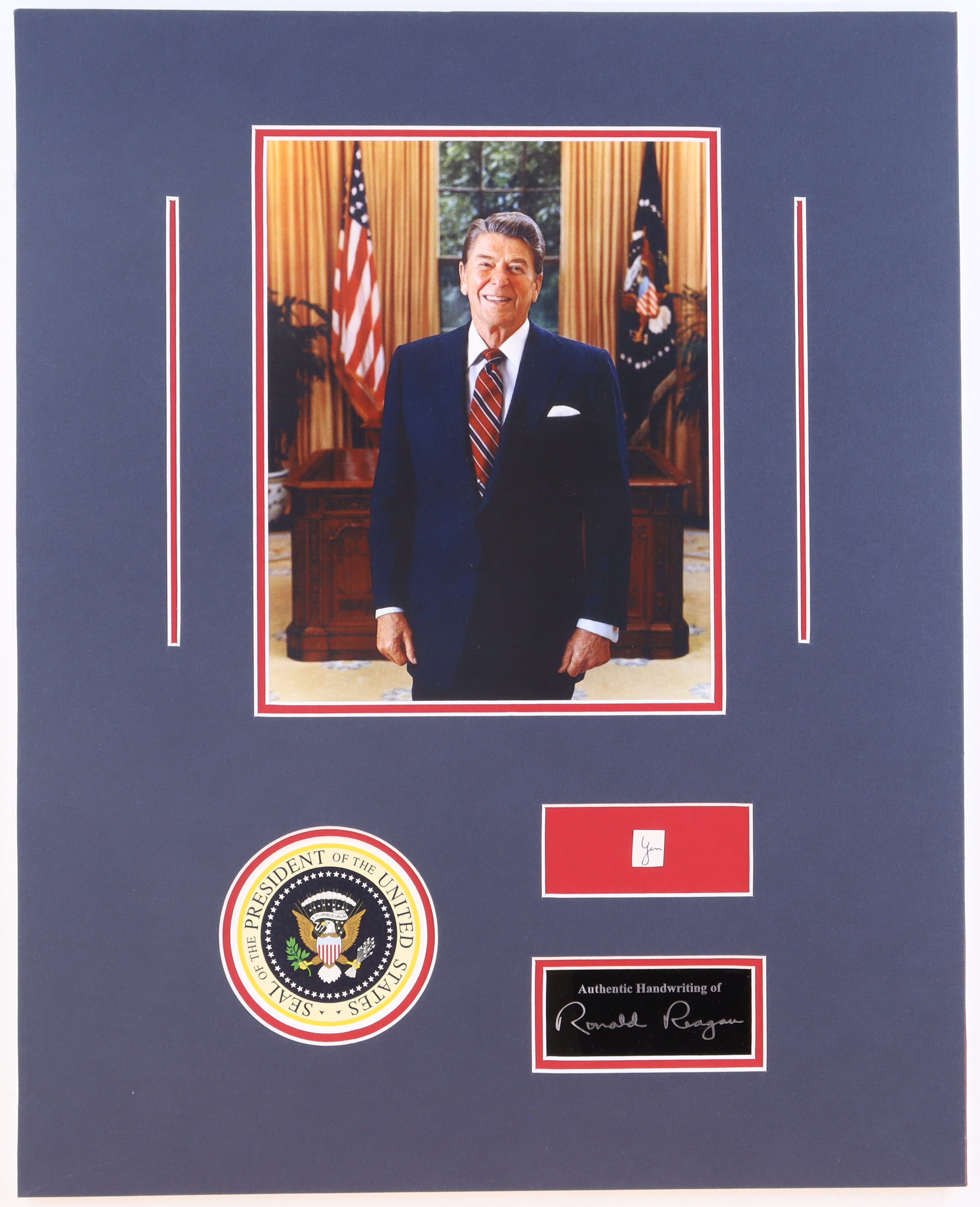 Custom matted display measures 16" x 20" in size and features a cut from a letter that had been hand-written by Ronald Reagan (D. 2004). Please note, Regan did not autograph the cut but he did write the word(s) that are featured on the cut.