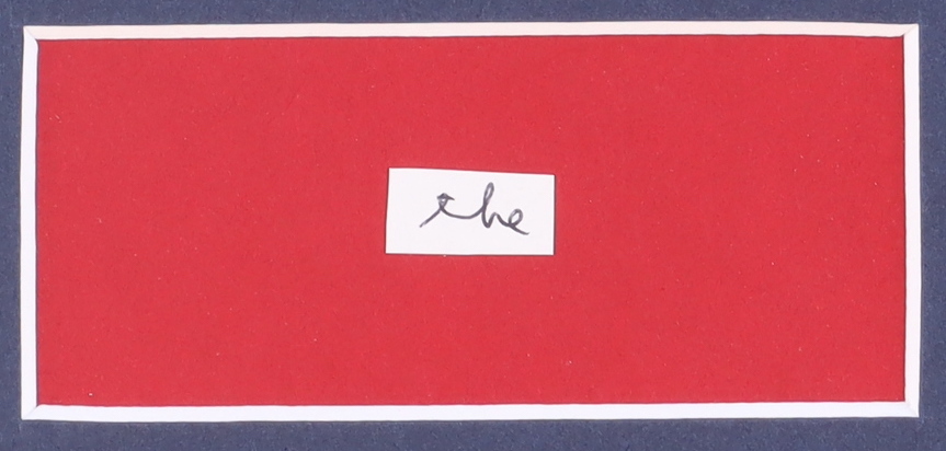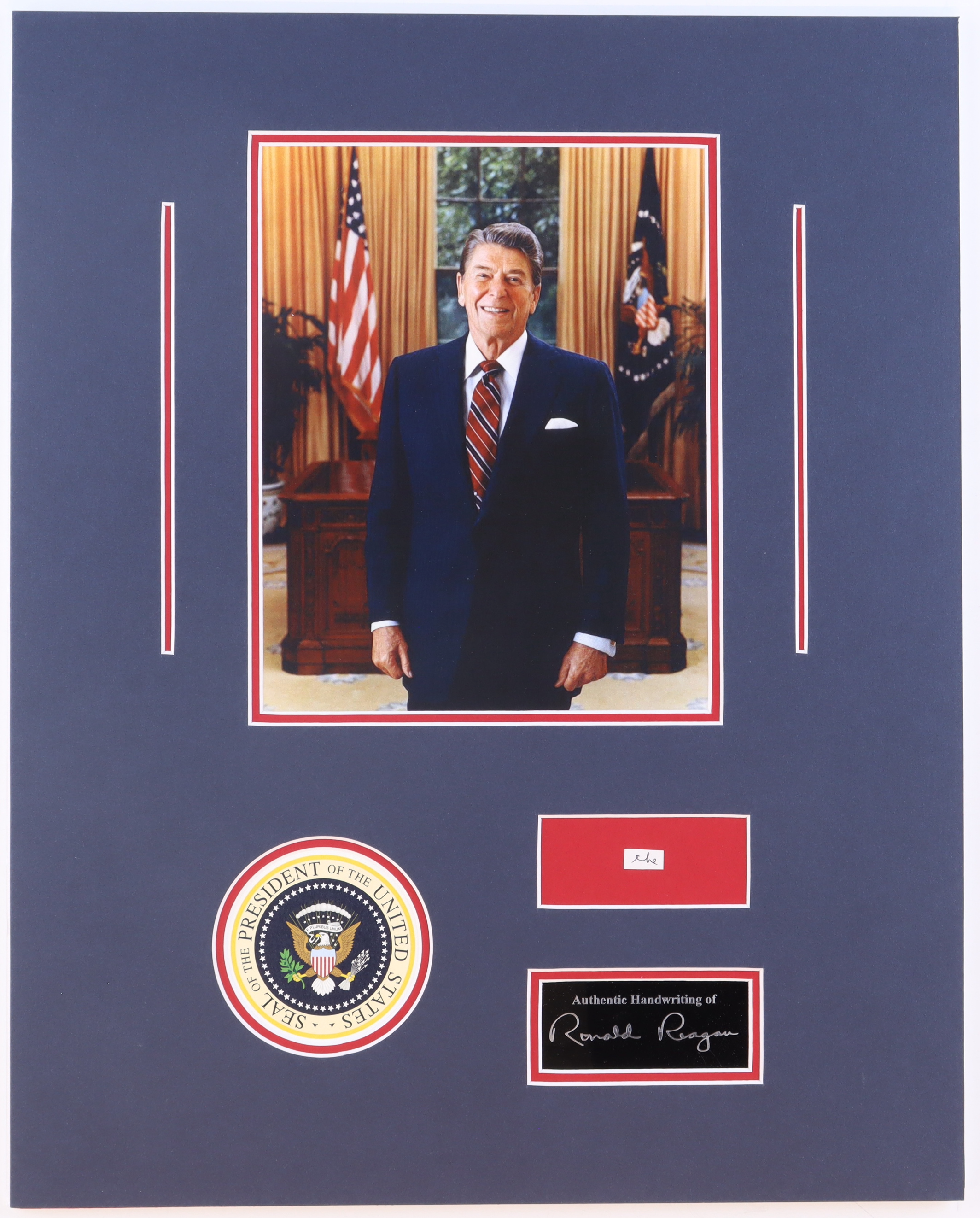 Custom matted display measures 16" x 20" in size and features a cut from a letter that had been hand-written by Ronald Reagan (D. 2004). Please note, Regan did not autograph the cut but he did write the word(s) that are featured on the cut.