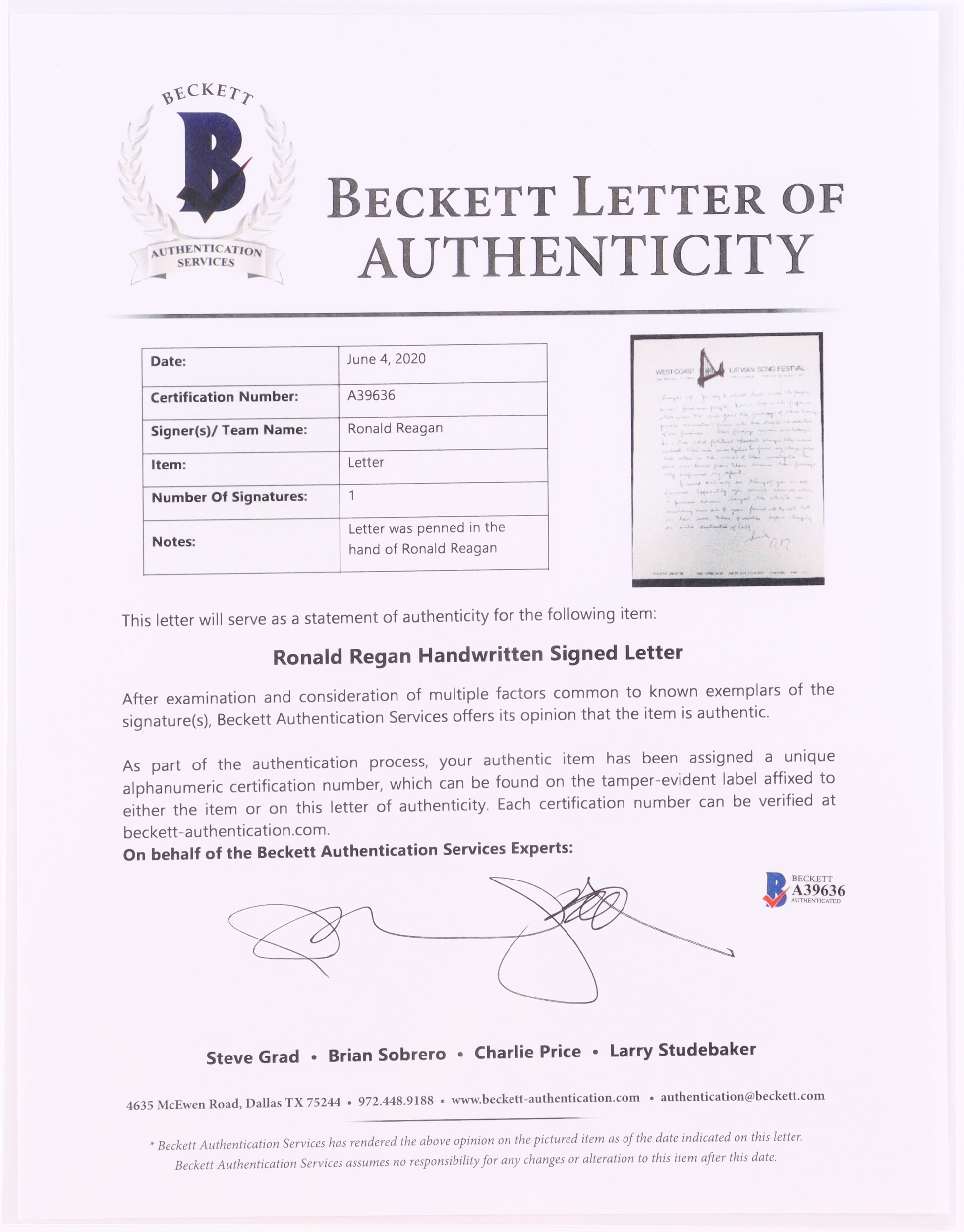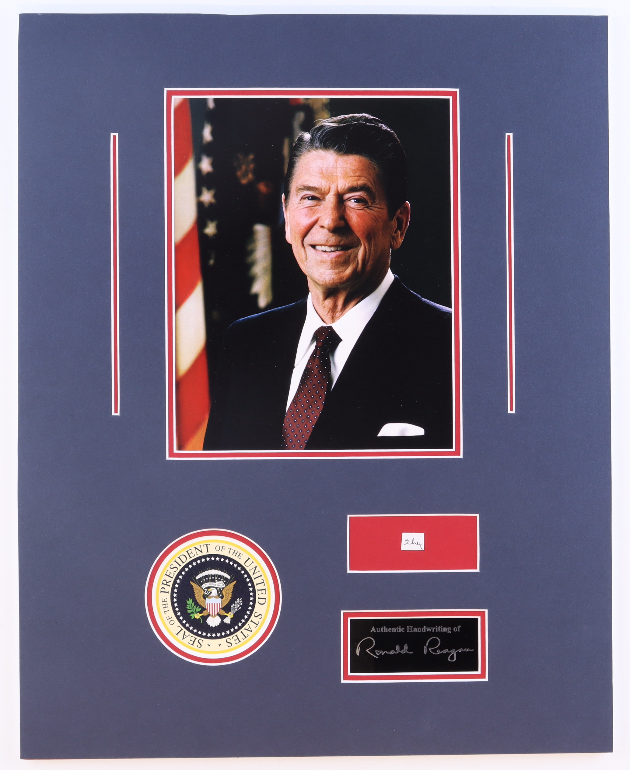 Custom matted display measures 16" x 20" in size and features a cut from a letter that had been hand-written by Ronald Reagan (D. 2004). Please note, Regan did not autograph the cut but he did write the word(s) that are featured on the cut.