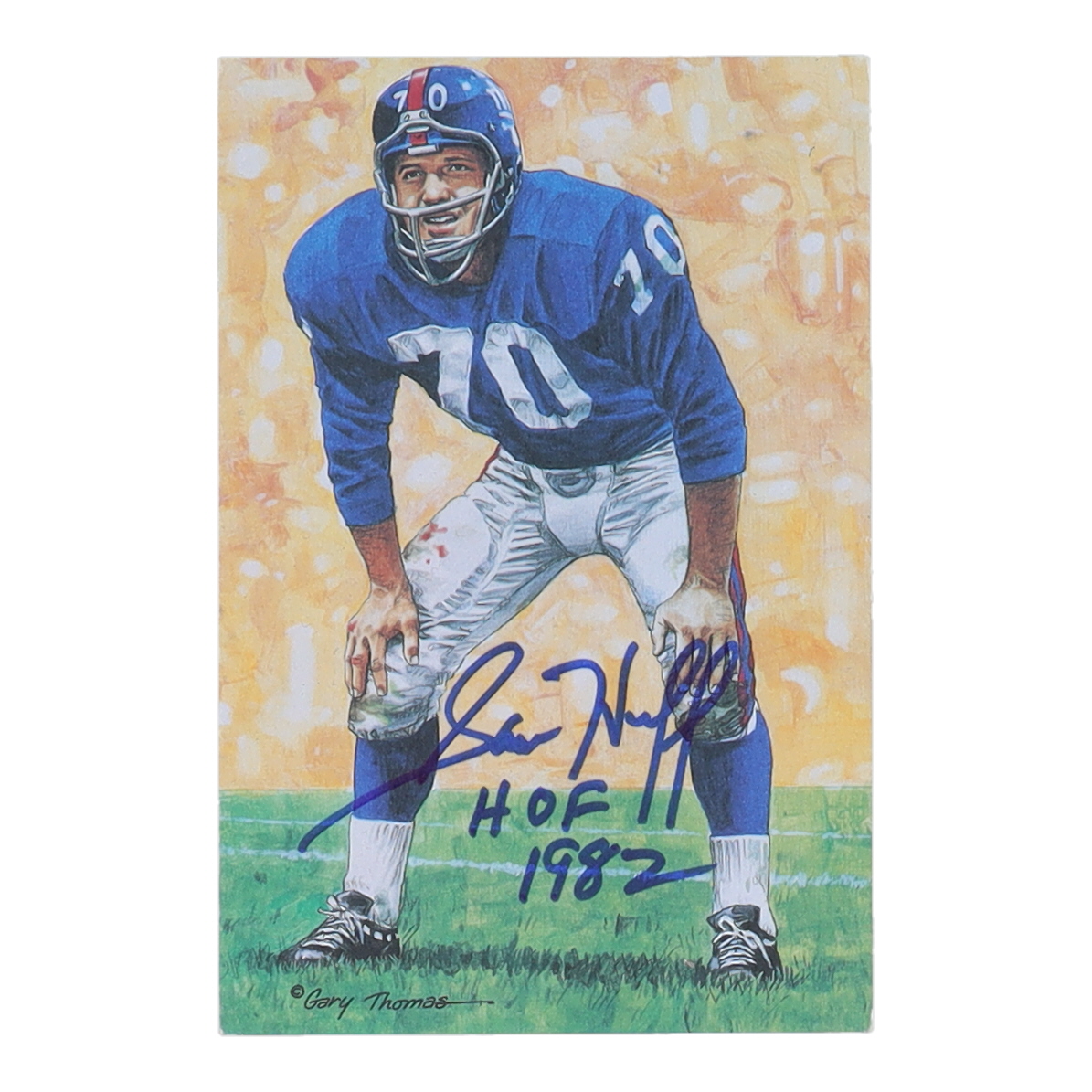 Card has been hand-signed and inscribed by Sam Huff (D. 2021, New York Giants, HOF). Please see photos for more details regarding the condition of the card.