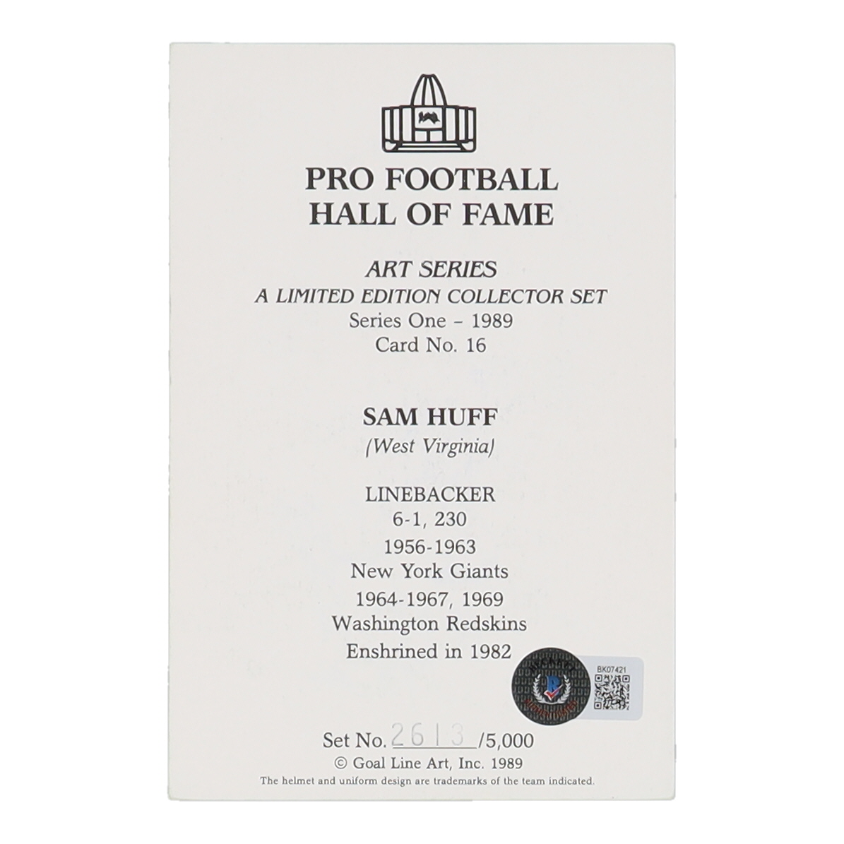 Sam Huff Signed 1989-97 Goal Line HOF #16 Inscribed "HOF 1982" (Beckett)