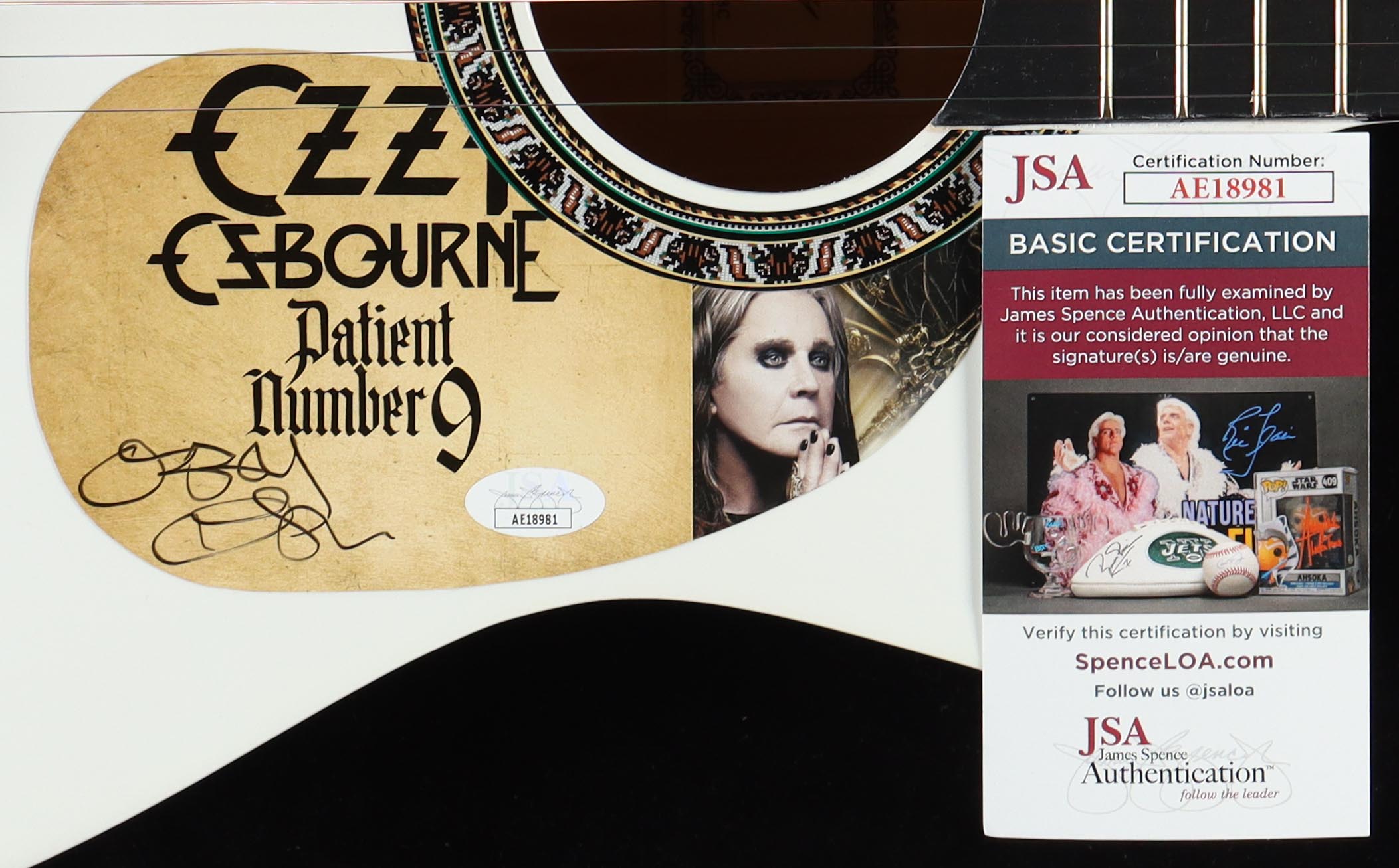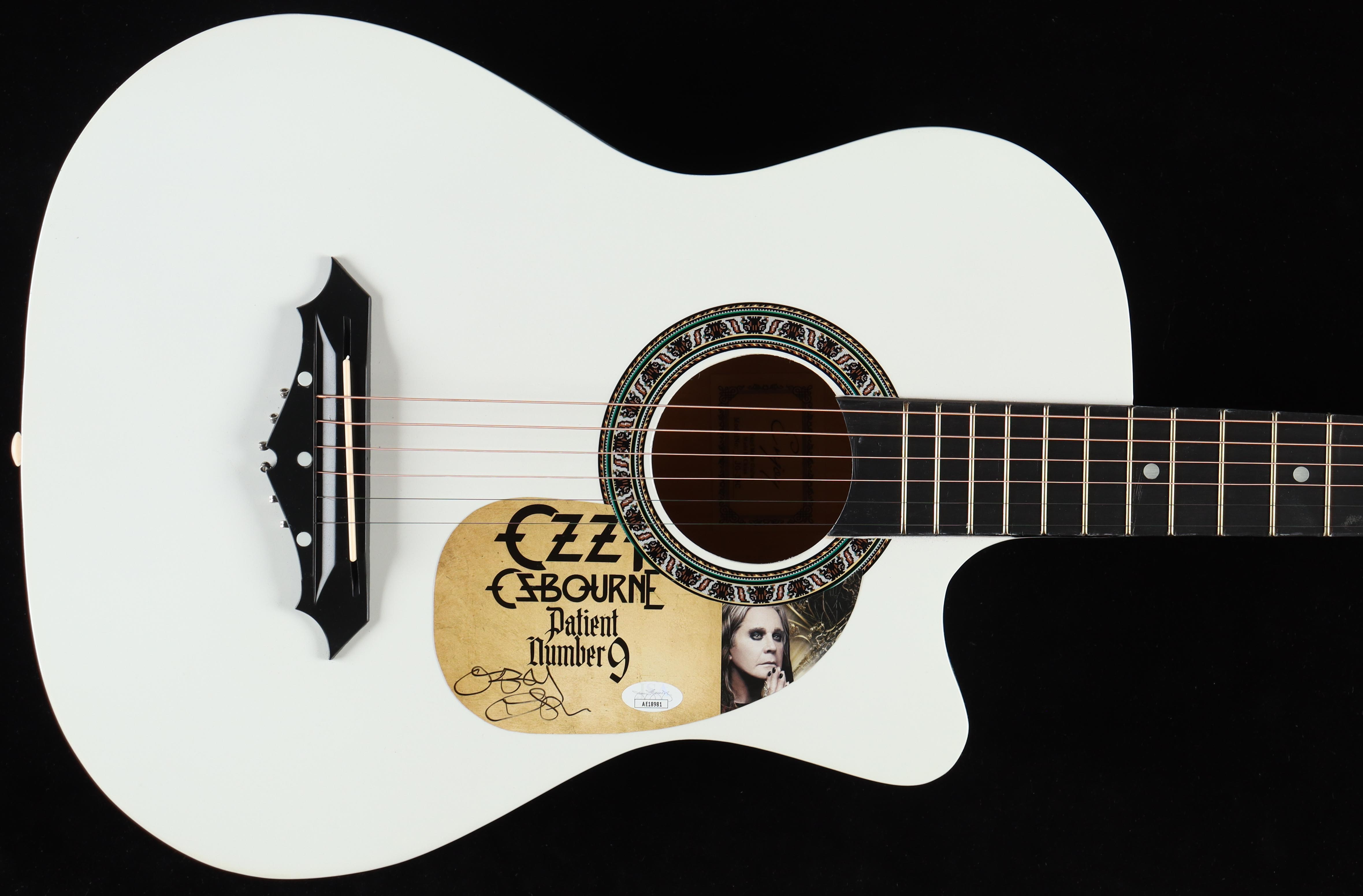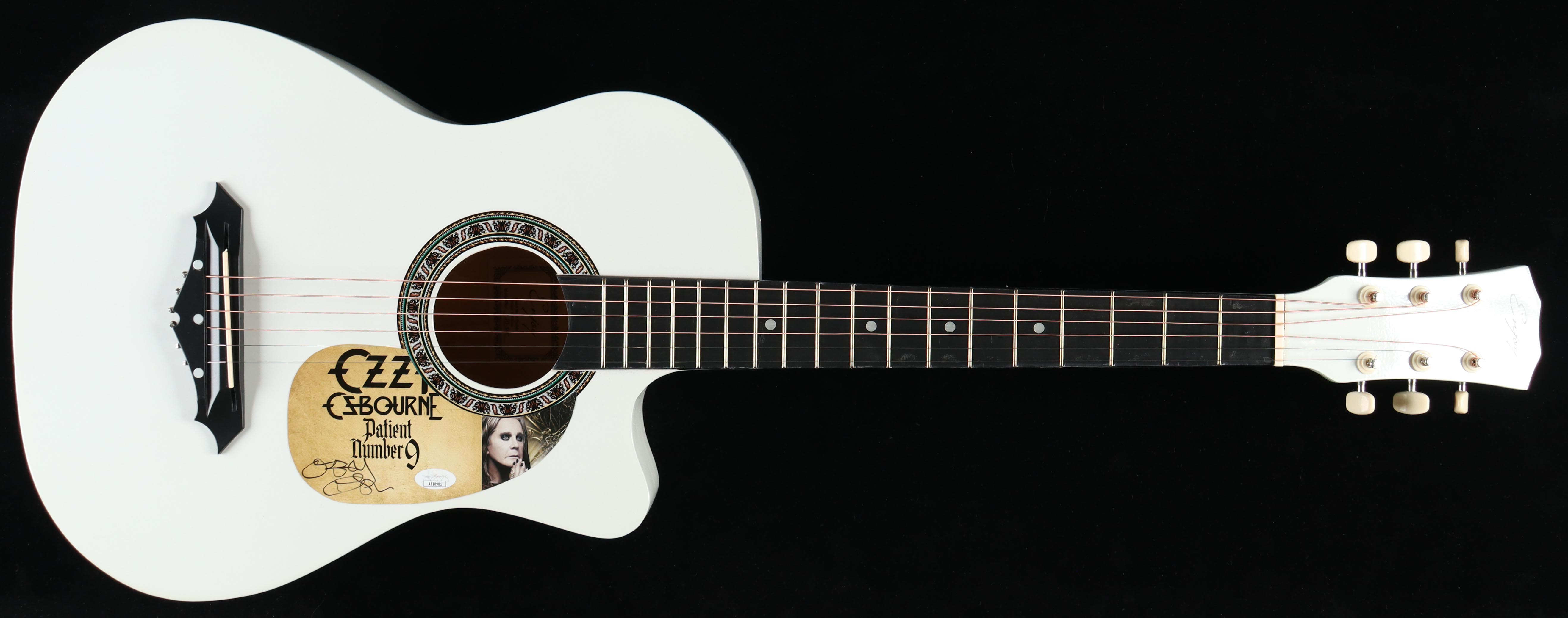 Acoustic Guitar measures approximately 38" in length and has been hand-signed on a CD cover that has been repurposed as a pick-guard by Ozzy Osbourne.