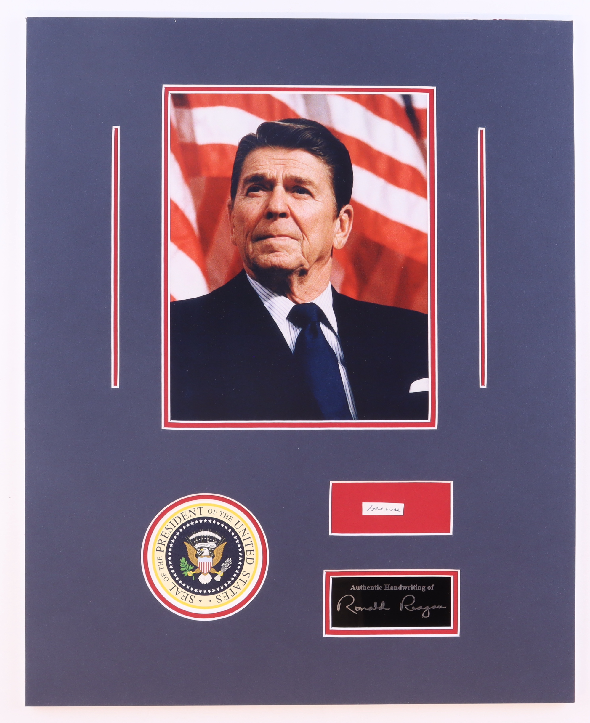 Custom matted display measures 16" x 20" in size and features a cut from a letter that had been hand-written by Ronald Reagan (D. 2004). Please note, Regan did not autograph the cut but he did write the word(s) that are featured on the cut.