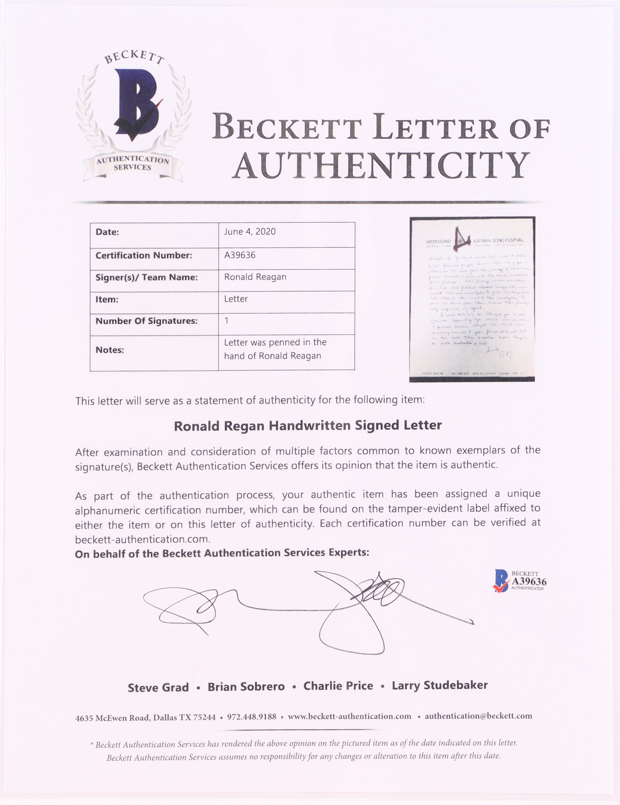 The autograph includes an official Beckett Authentication Services hologram and matching LOA for authenticity purposes.