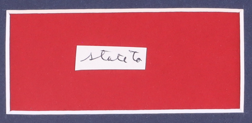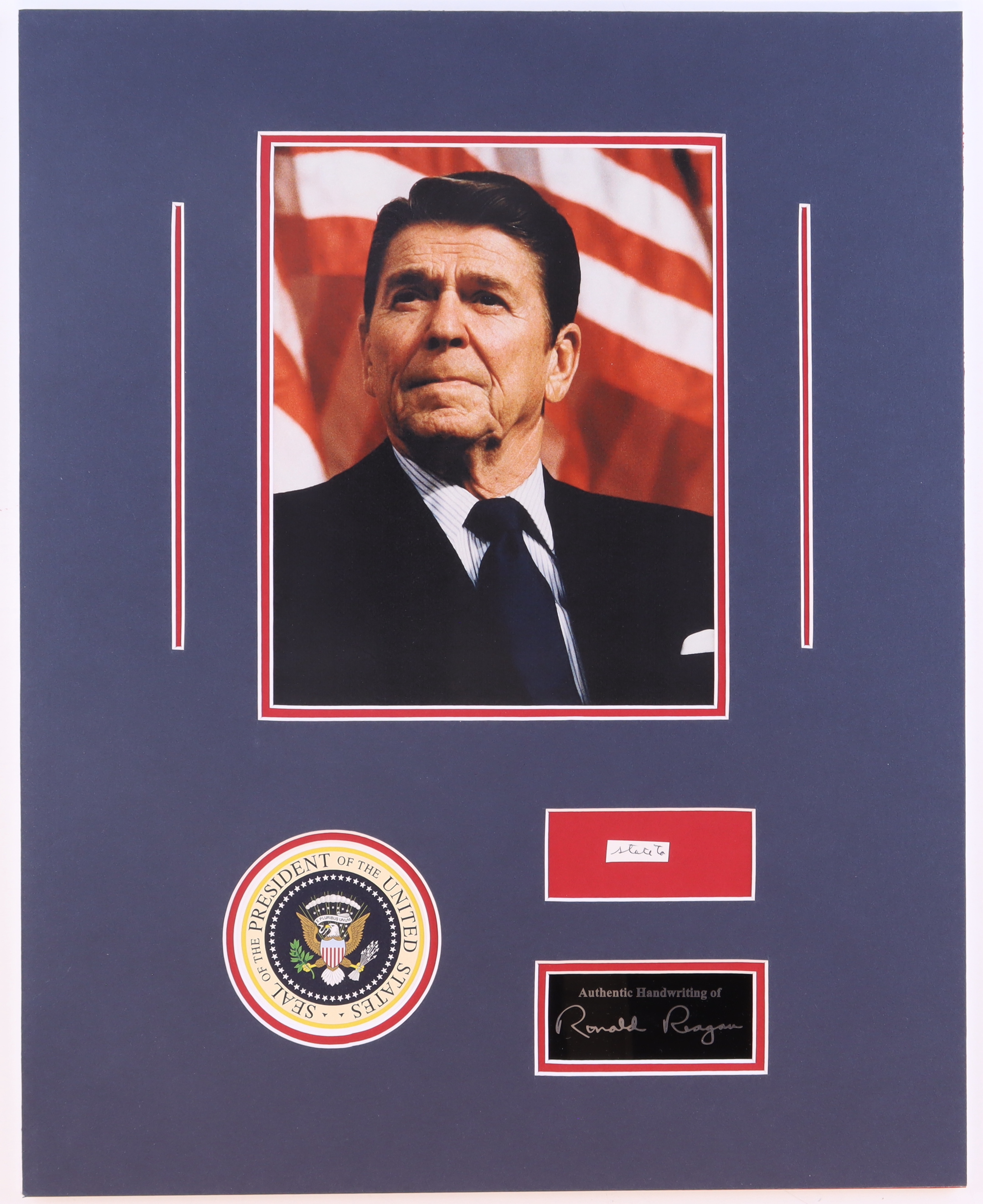 Custom matted display measures 16" x 20" in size and features a cut from a letter that had been hand-written by Ronald Reagan (D. 2004). Please note, Regan did not autograph the cut but he did write the word(s) that are featured on the cut.