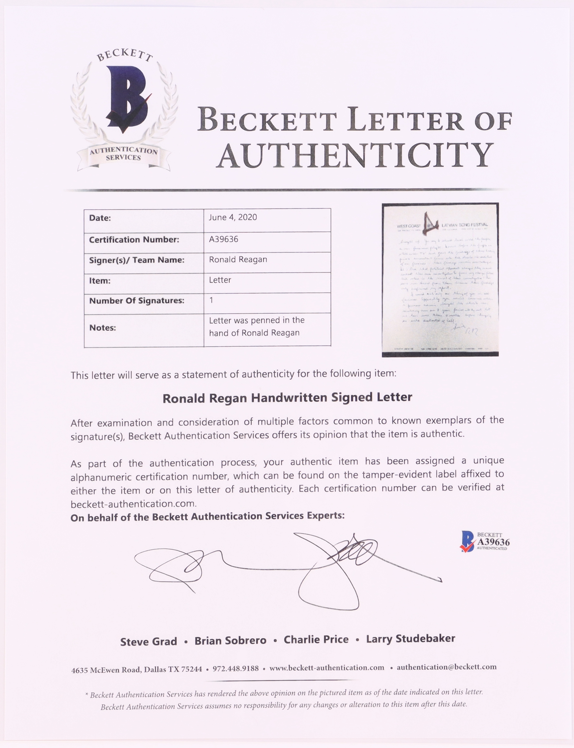 The autograph includes an official Beckett Authentication Services hologram and matching LOA for authenticity purposes.