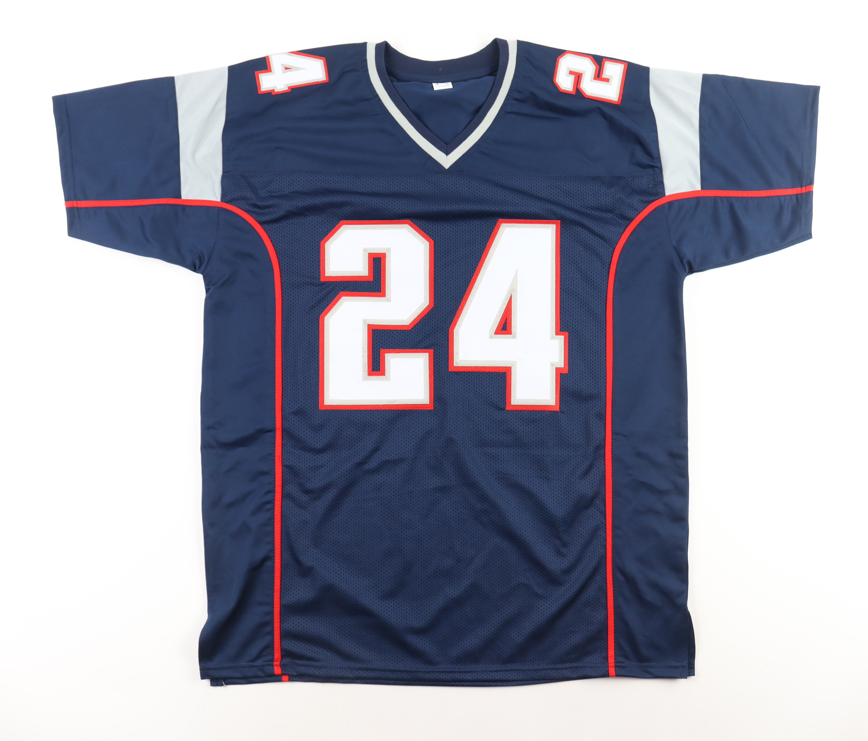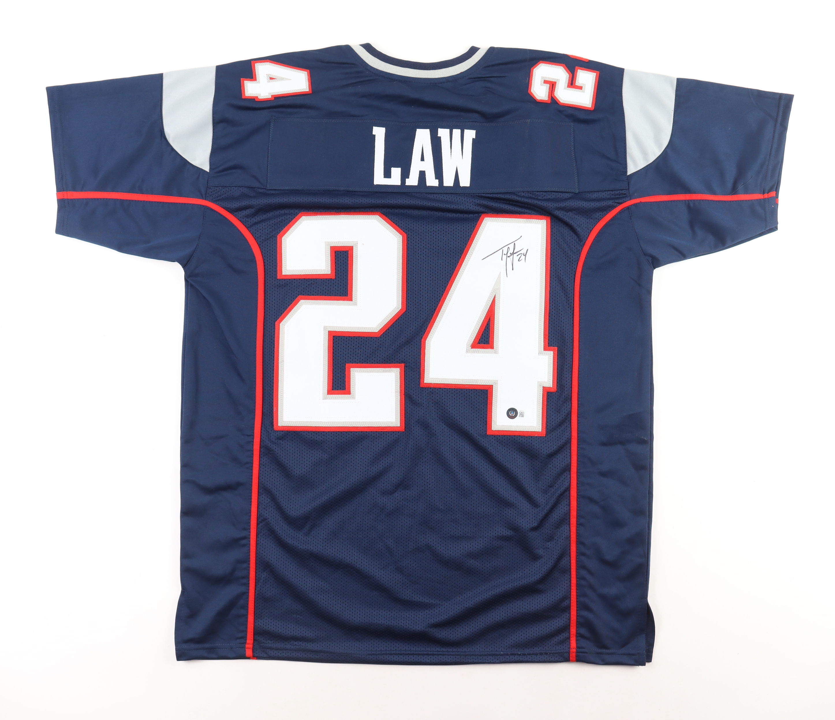 Custom jersey with everything sewn on, size XL. Hand-signed by Ty Law (HOF).