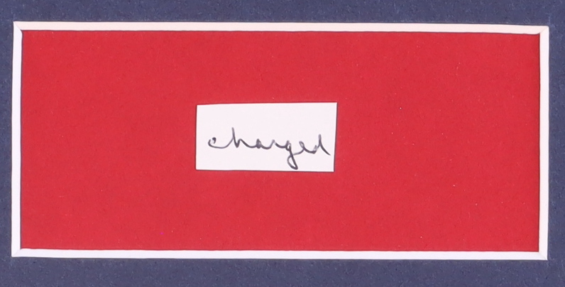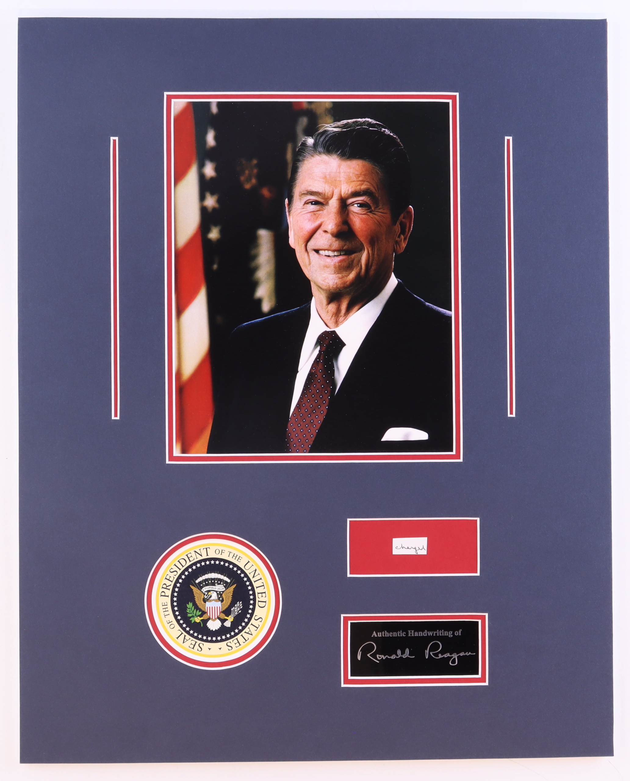 Custom matted display measures 16" x 20" in size and features a cut from a letter that had been hand-written by Ronald Reagan (D. 2004). Please note, Regan did not autograph the cut but he did write the word(s) that are featured on the cut.