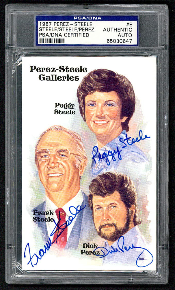 Peggy Steele, Frank Steele & Dick Perez Signed 1980-02 Perez-Steele Hall of Fame Postcards #E Perez-Steele Galleries (PSA Encapsulated)
