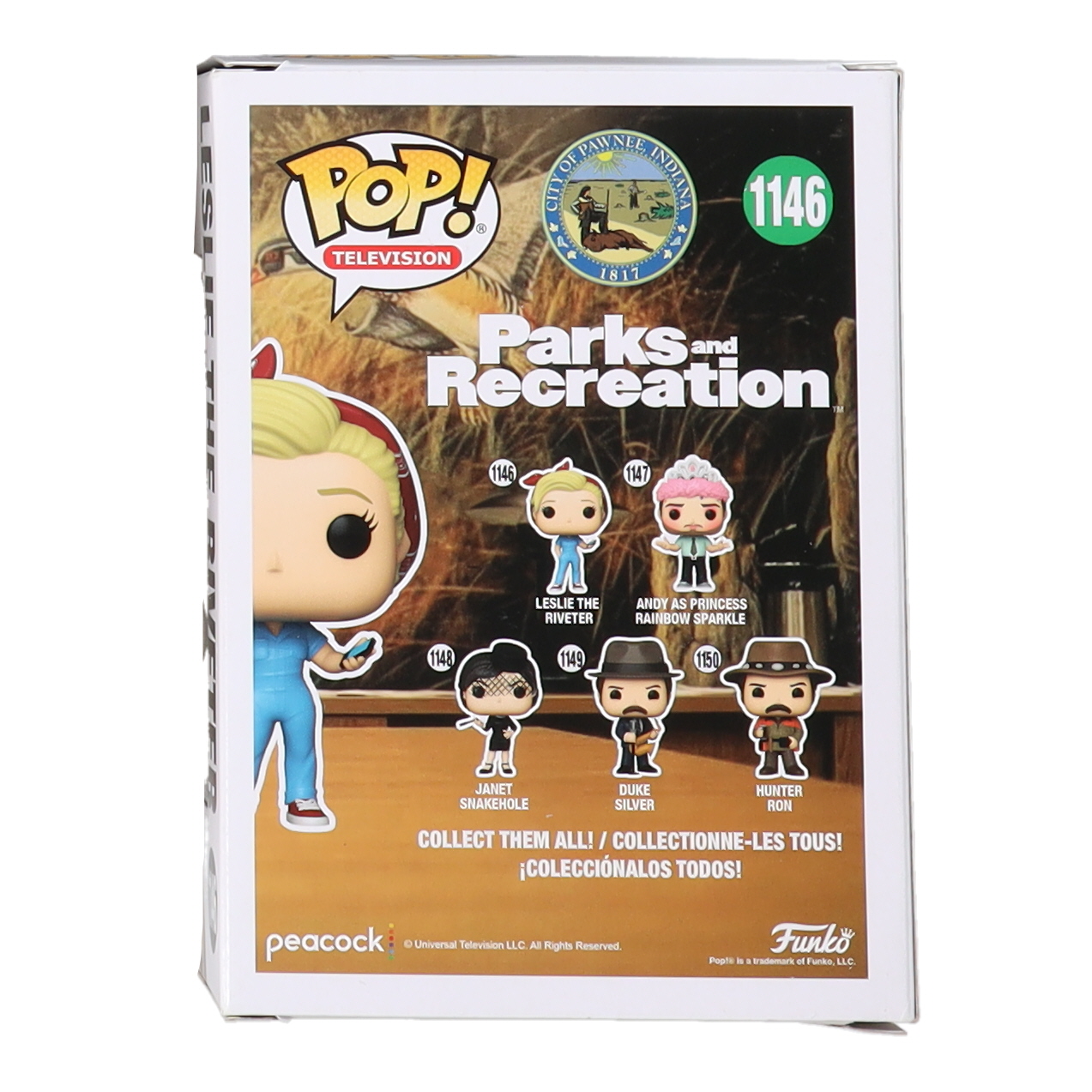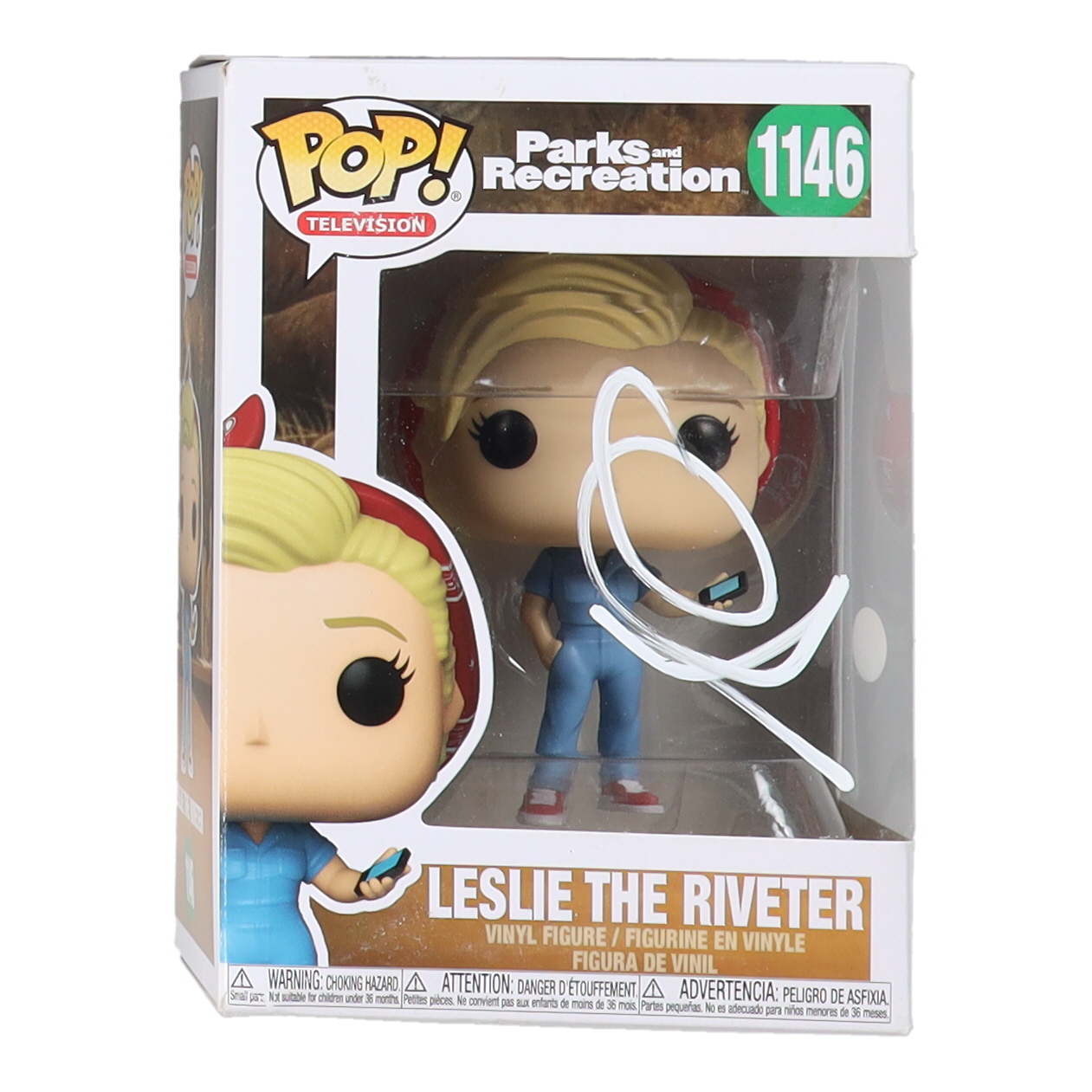Figure measures approximately 4" tall. Hand-signed on the packaging by Amy Poehler (Leslie Knope). Please note, the top and bottom-left corners have damage and the signature is smudged.