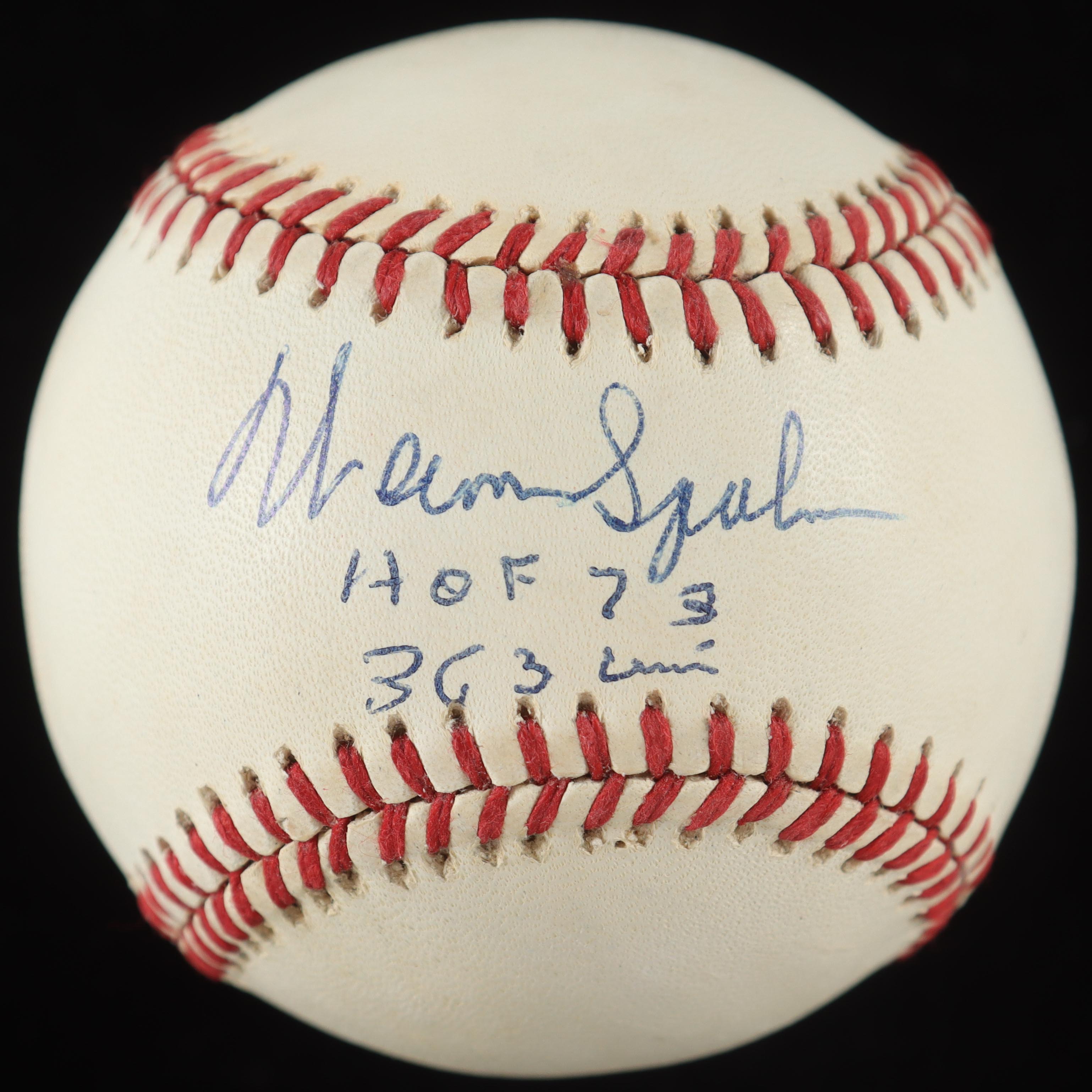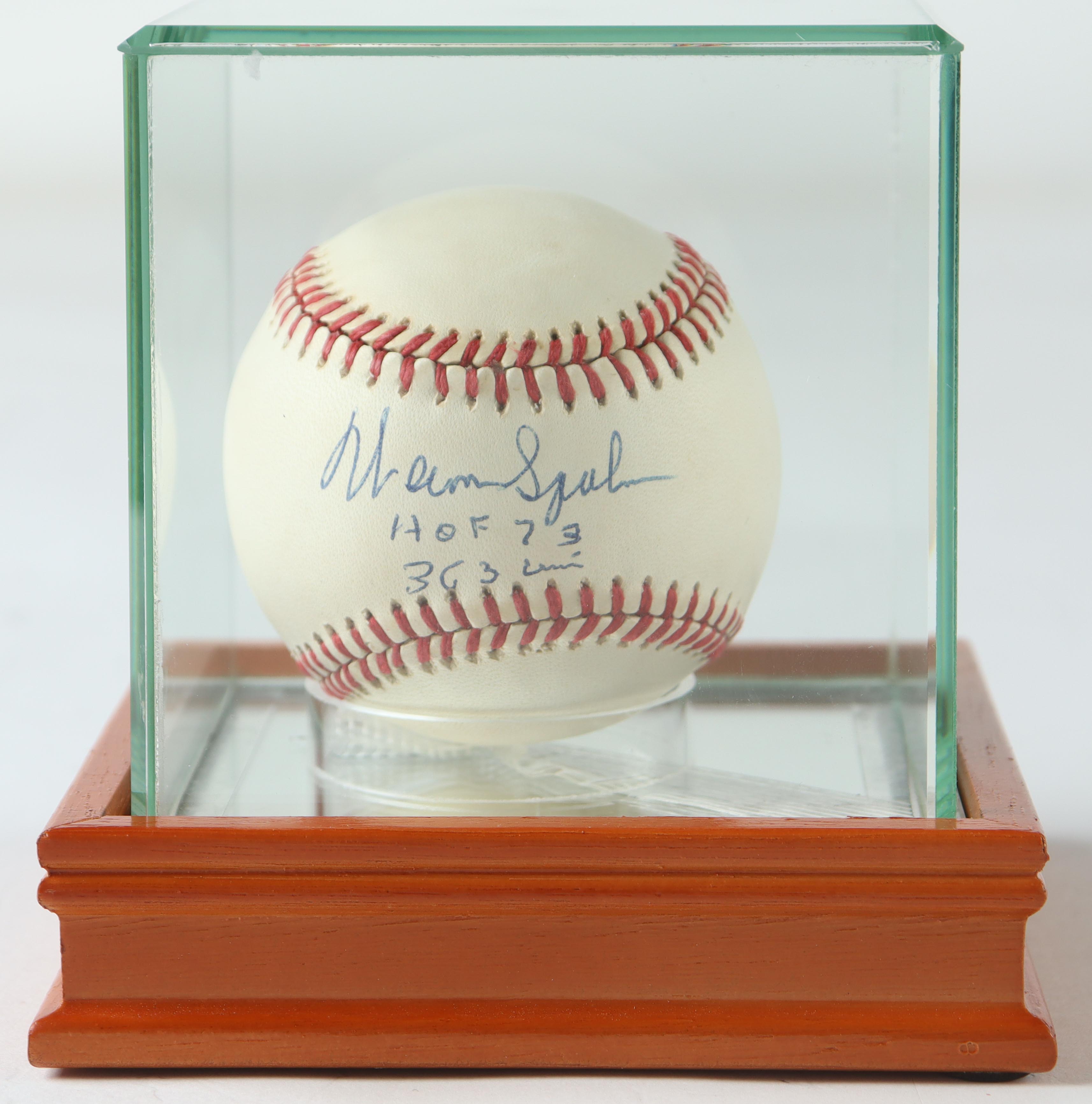 Warren Spahn Signed ONL Baseball Inscribed "HOF 73" & "363 Wins" with Display Case (PSA)