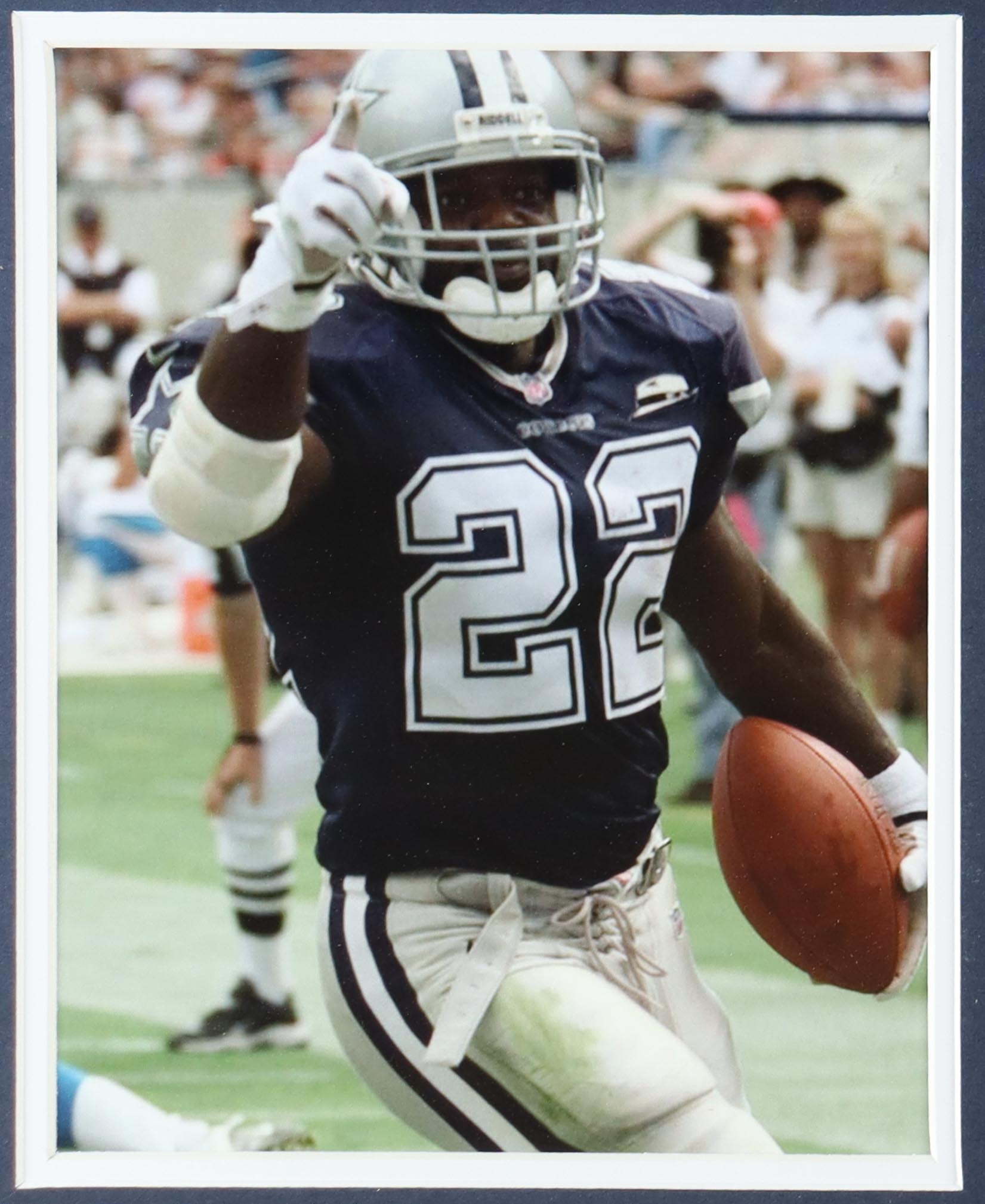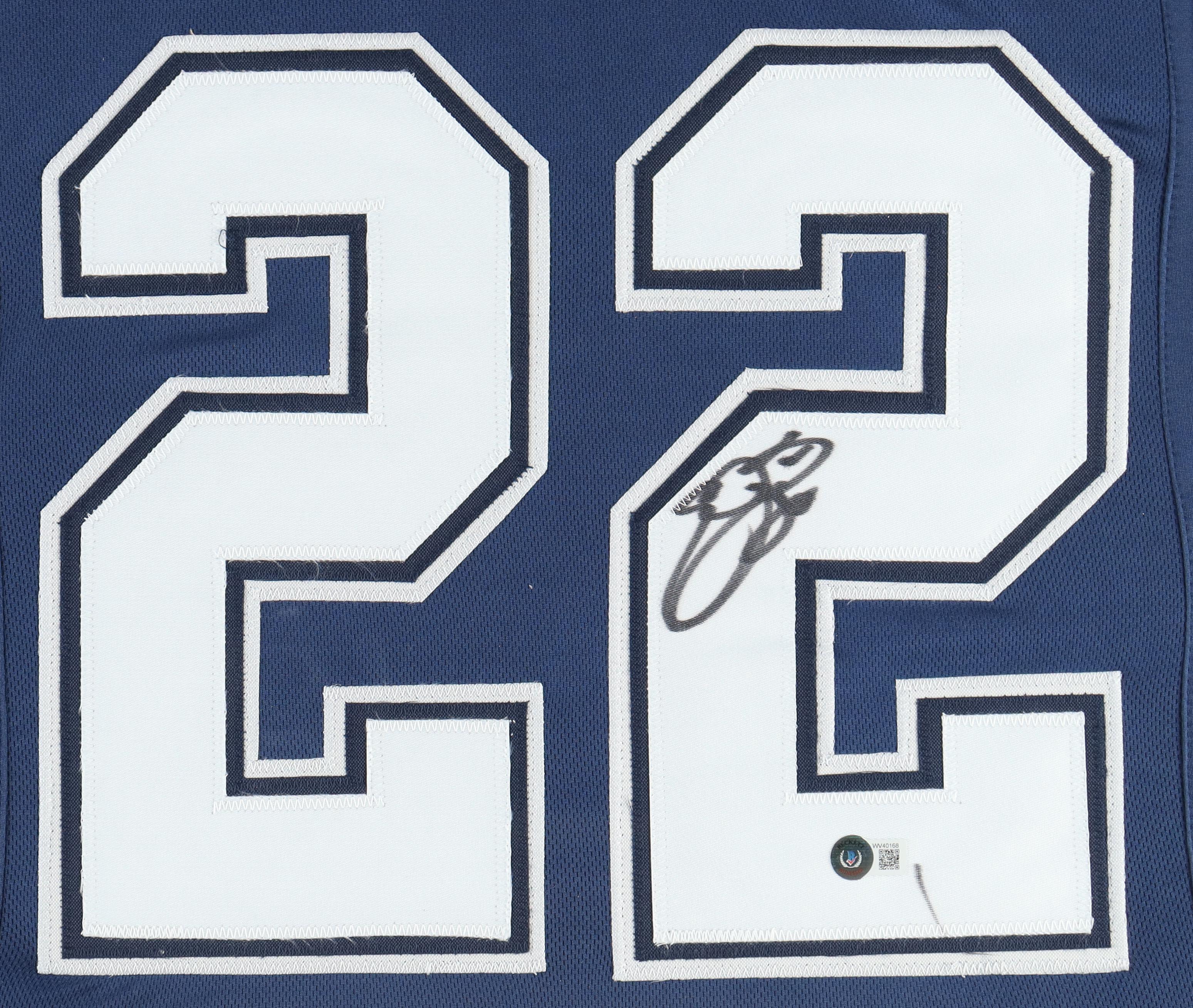 Custom frame measures 35.5" x 43.5" in size and features a jersey hand-signed by Emmitt Smith (HOF). Please note, the jersey has a stray pen mark near the hologram.