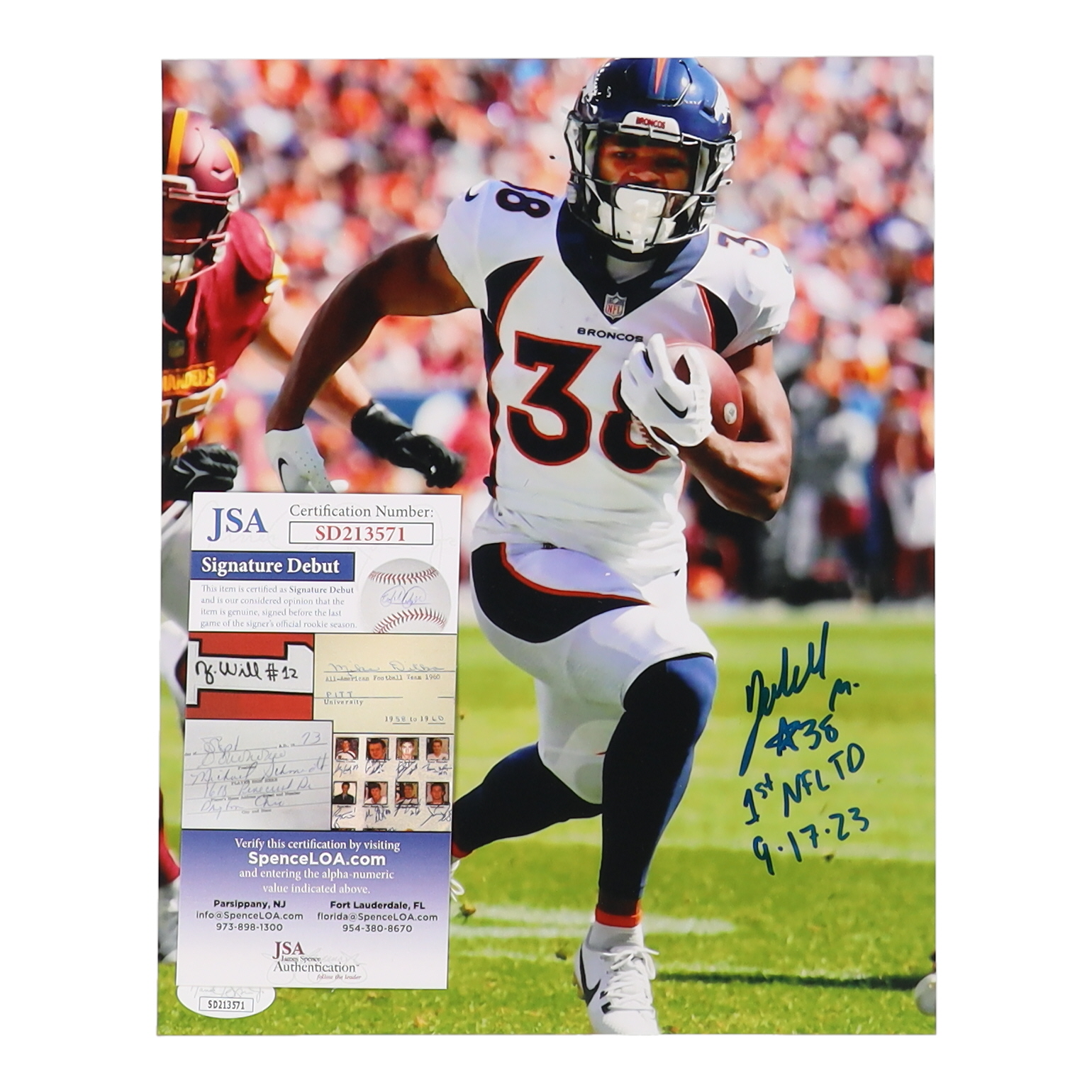 The autograph(s) includes an official James Spence Authentication (JSA) "Signature Debut" hologram and COA. "Signature Debut" is the autographed memorabilia equivalent to a rookie card. The JSA definition of a "Signature Debut" is as follows: "Any item that is autographed and received by JSA prior to the last game of the signer's official rookie season.
