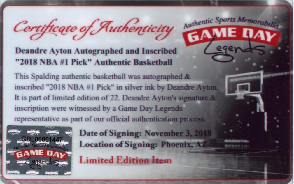 Deandre Ayton Signed LE Official NBA Game Ball Basketball Inscribed "2018 NBA #1 Pick" (Game Day Legends & Steiner)