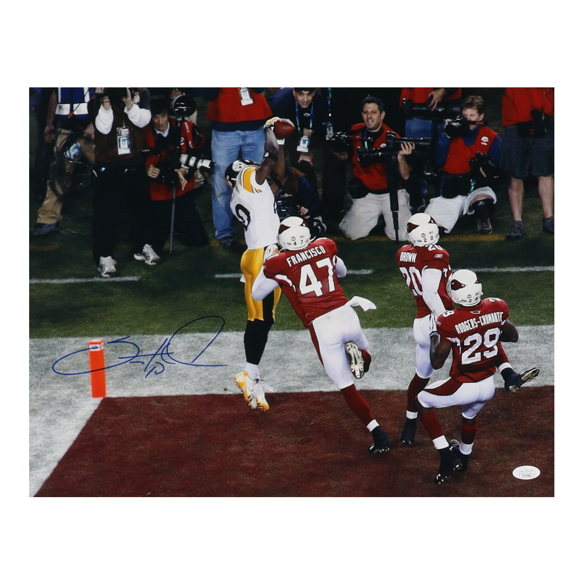 Photo measures 16" x 20" in size. Hand-signed by Santonio Holmes (Pittsburgh Steelers).