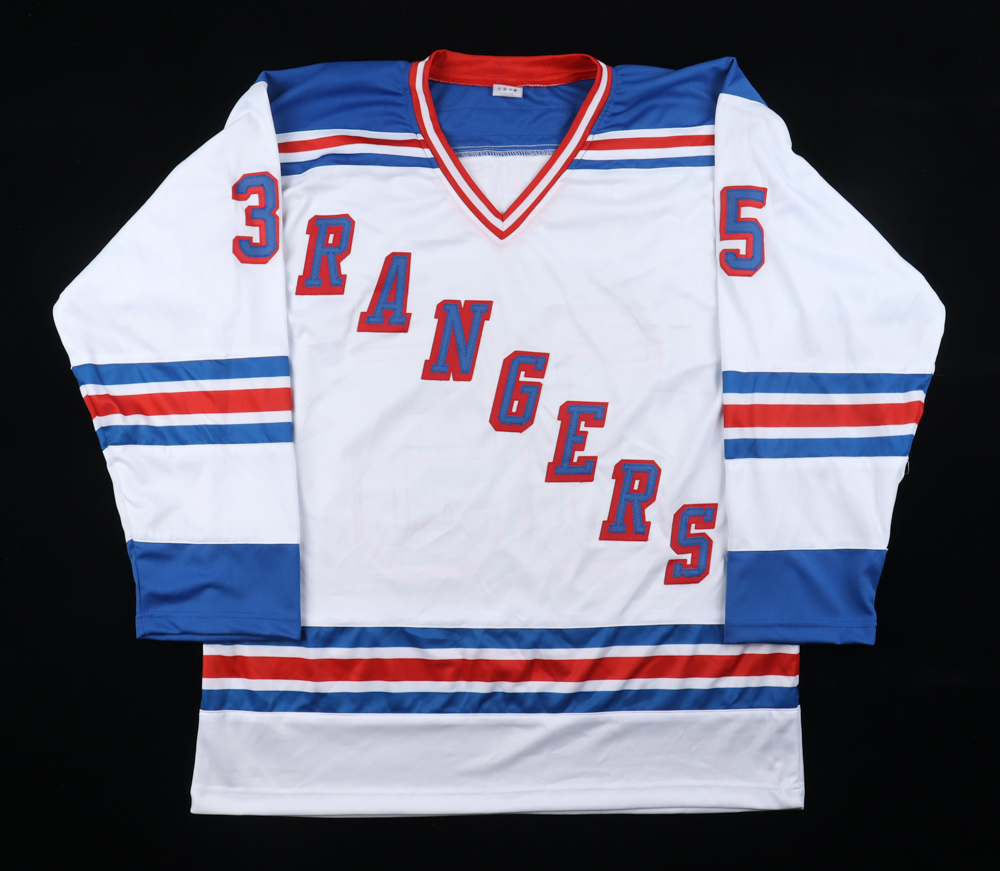 Custom jersey with everything sewn on, size XL. Hand-signed by Mike Richter (HOF). Please note, there is a stain on the front of the jersey.