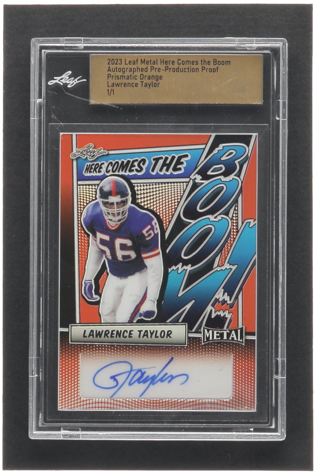 Lawrence Taylor 2023 Leaf Metal Here Comes the Boom Prismatic Orange Pre-Production Proof #NNO #1/1 (Leaf)