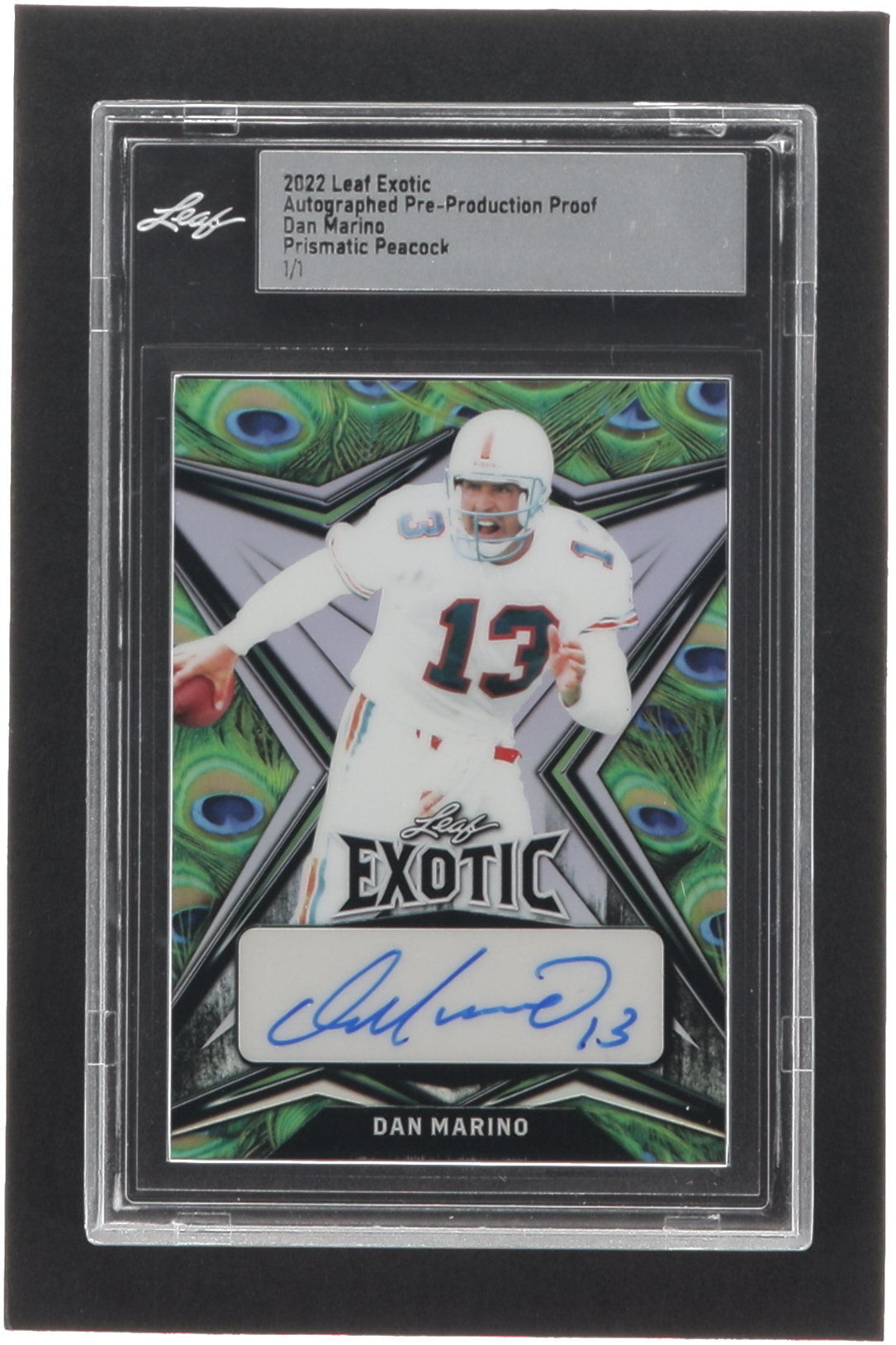 Dan Marino 2022 Leaf Exotic Autographed Pre-Production Proof Prismatic Peacock #1/1 (Leaf)