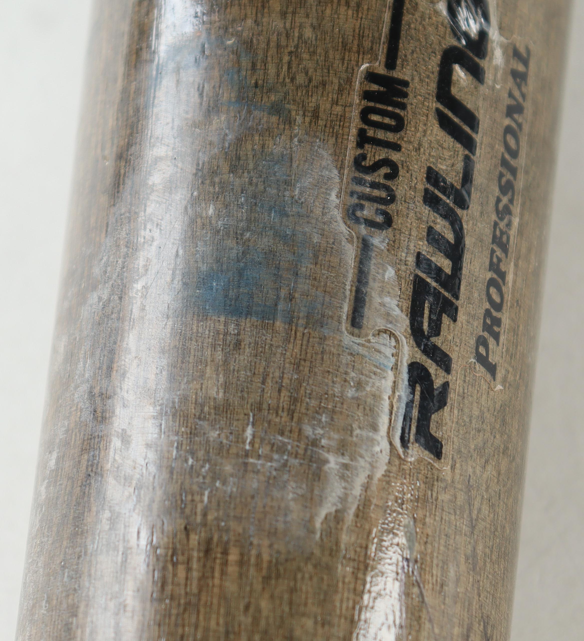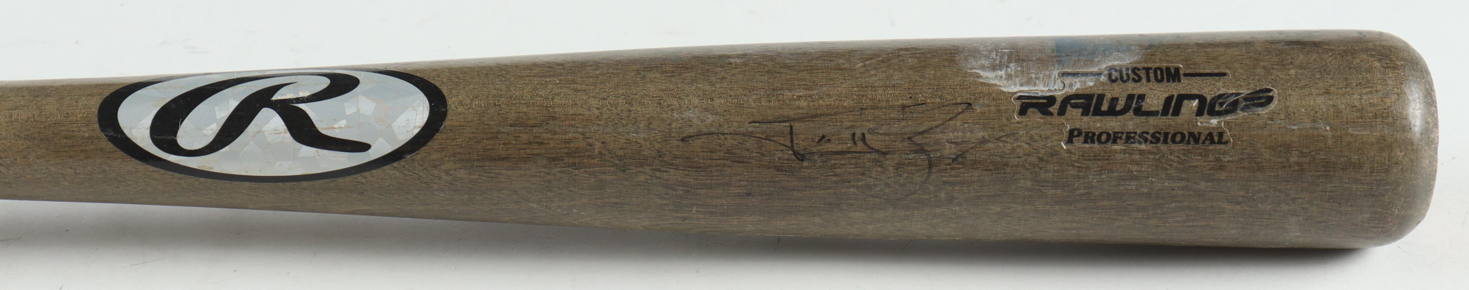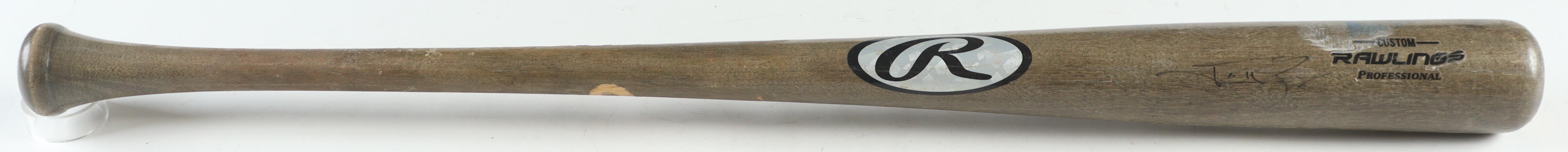 Rawlings baseball bat. Hand-signed by Jonny Gomes (Tampa Bay Rays). The bat has been game-used by an unknown player and shows associated scuffing and cracks.