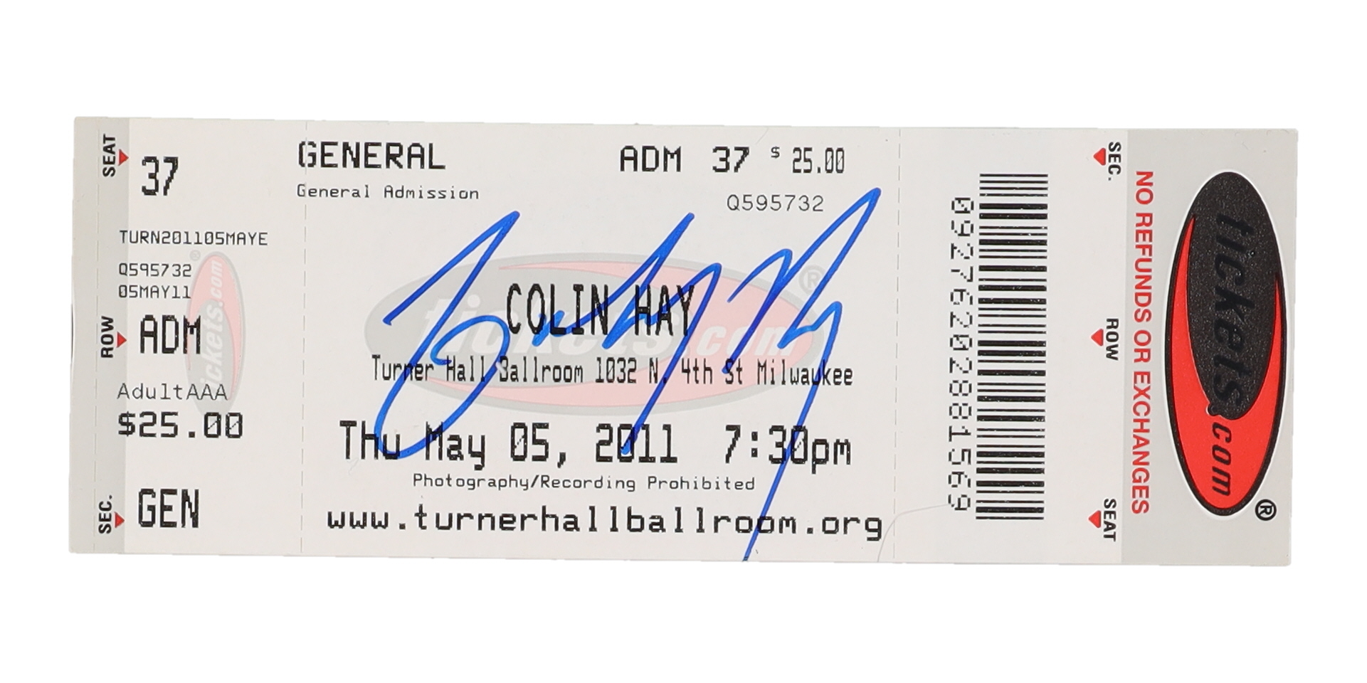Ticket is dated May 05, 2011. Hand-signed by Colin Hay. Refer to photos for condition of the item.