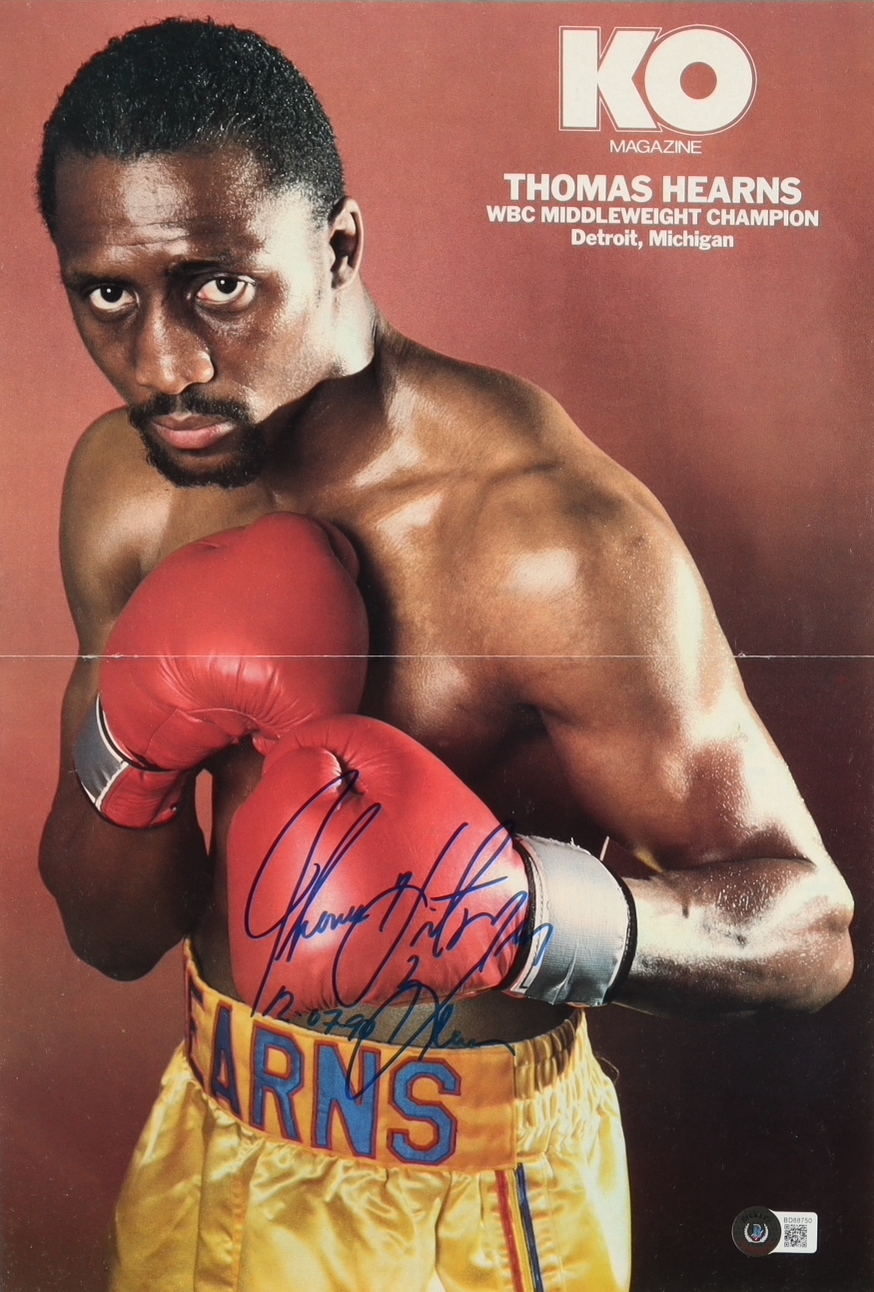KO Magazine cover measures 8.5" x 11" and has been hand-signed and inscribed on the cover by Thomas Hearns (HOF).