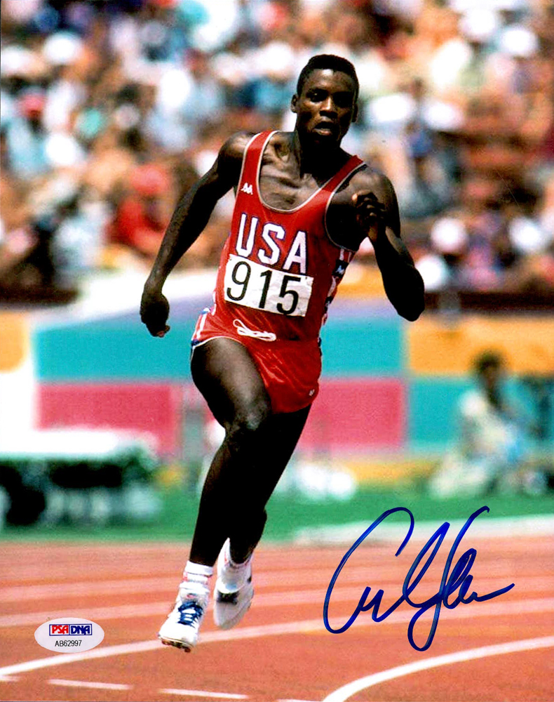 Photo measures 8" x 10" in size. Hand-signed in blue felt tip pen by Carl Lewis.