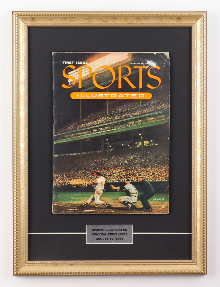 Custom framed display measures approximately 14" x 19" in size. Features a vintage first issue Sports Illustrated magazine from August 16, 1954. Please note that the magazine is not signed. See photos for more details regarding the condition of the display.