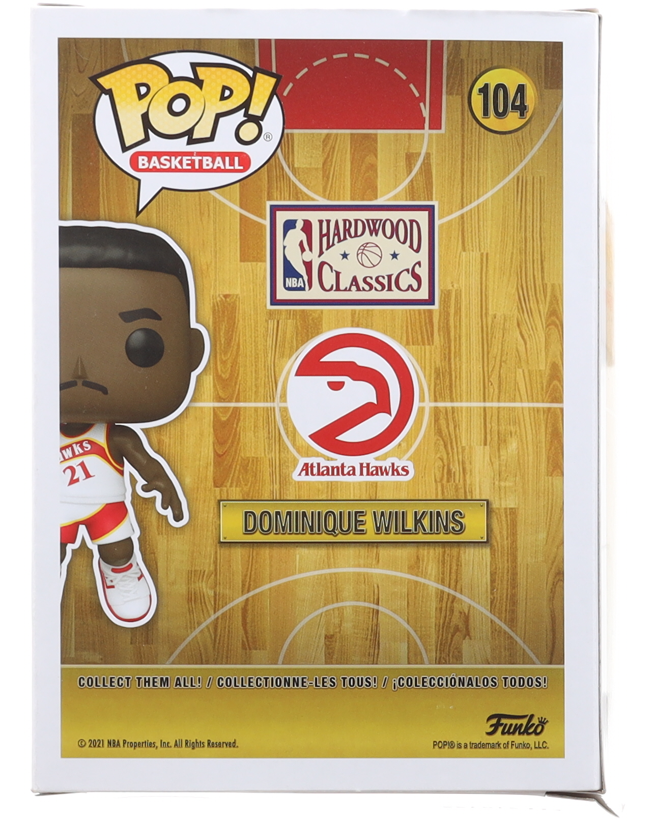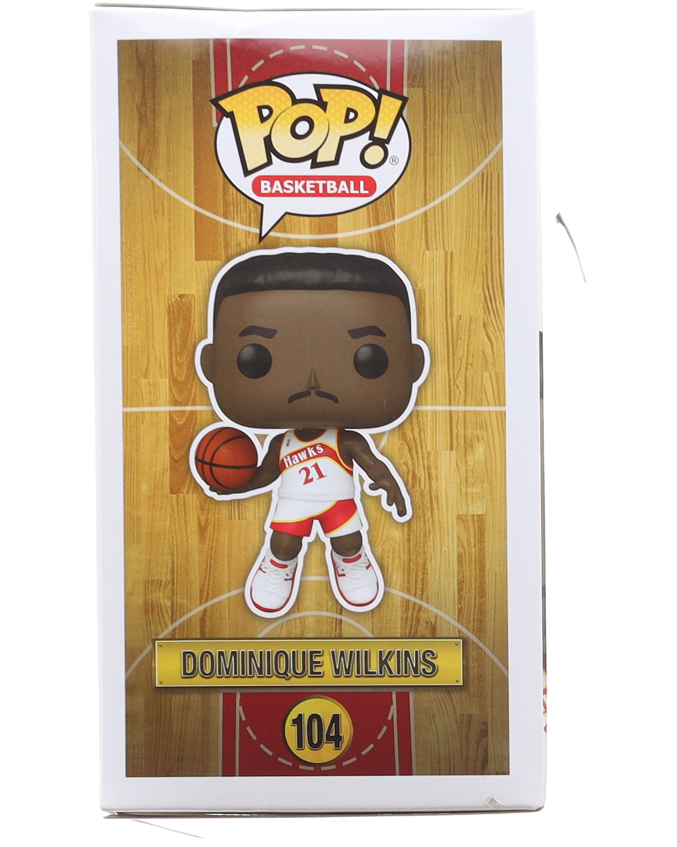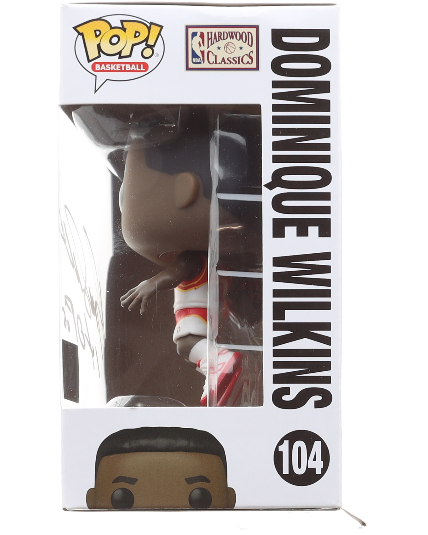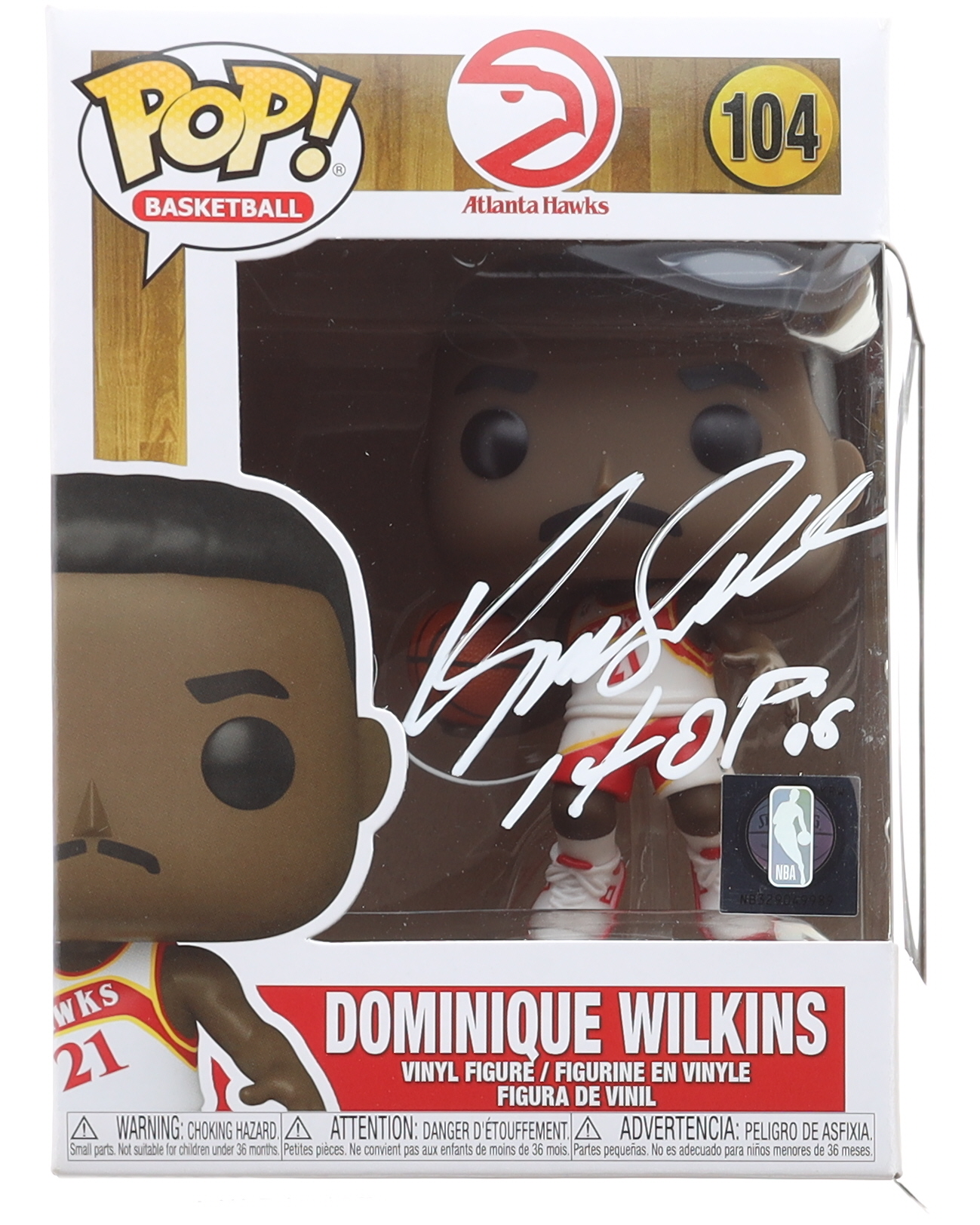 Funko Pop! vinyl figure measures approximately 4" tall. Hand-signed and inscribed on the packaging by Dominique Wilkins (Atlanta Hawks, HOF).