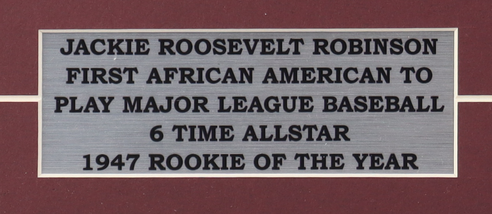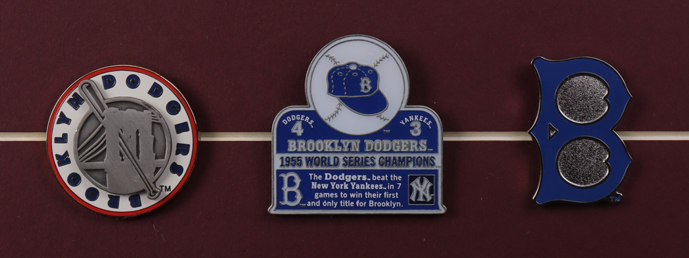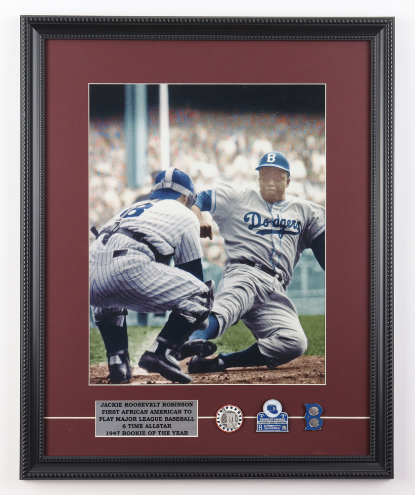 Custom frame measures approximately 17" x 21" in size and features a photo of Jackie Robinson (D. 1972, Brooklyn Dodgers, HOF). Display also features a 1955 World Series Pin and (2) Brooklyn Team Pins. Please note, the display is unsigned.