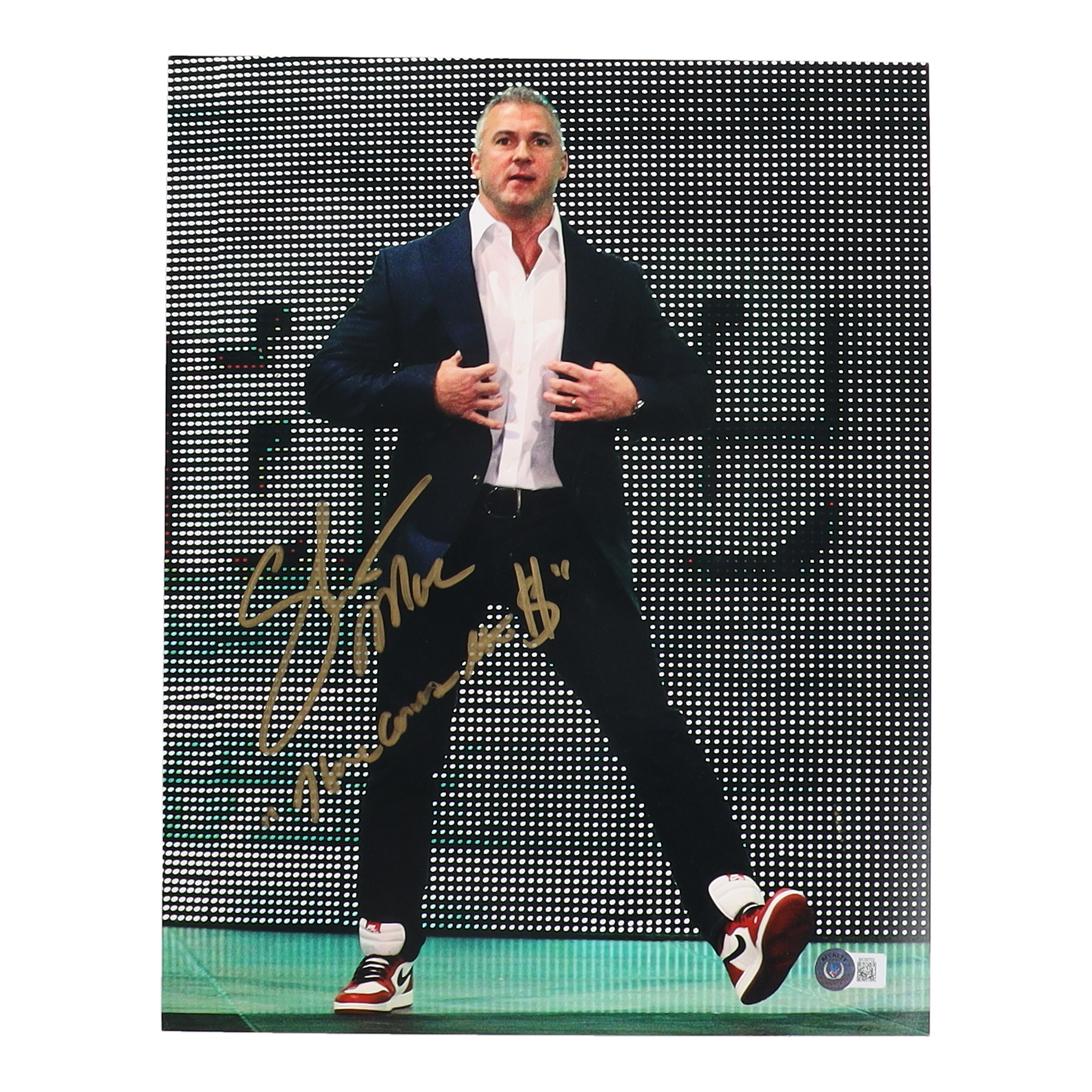 Photo measures 11" x 14" in size and has been hand-signed and inscribed by Shane McMahon. Please note, an inscription has been removed.