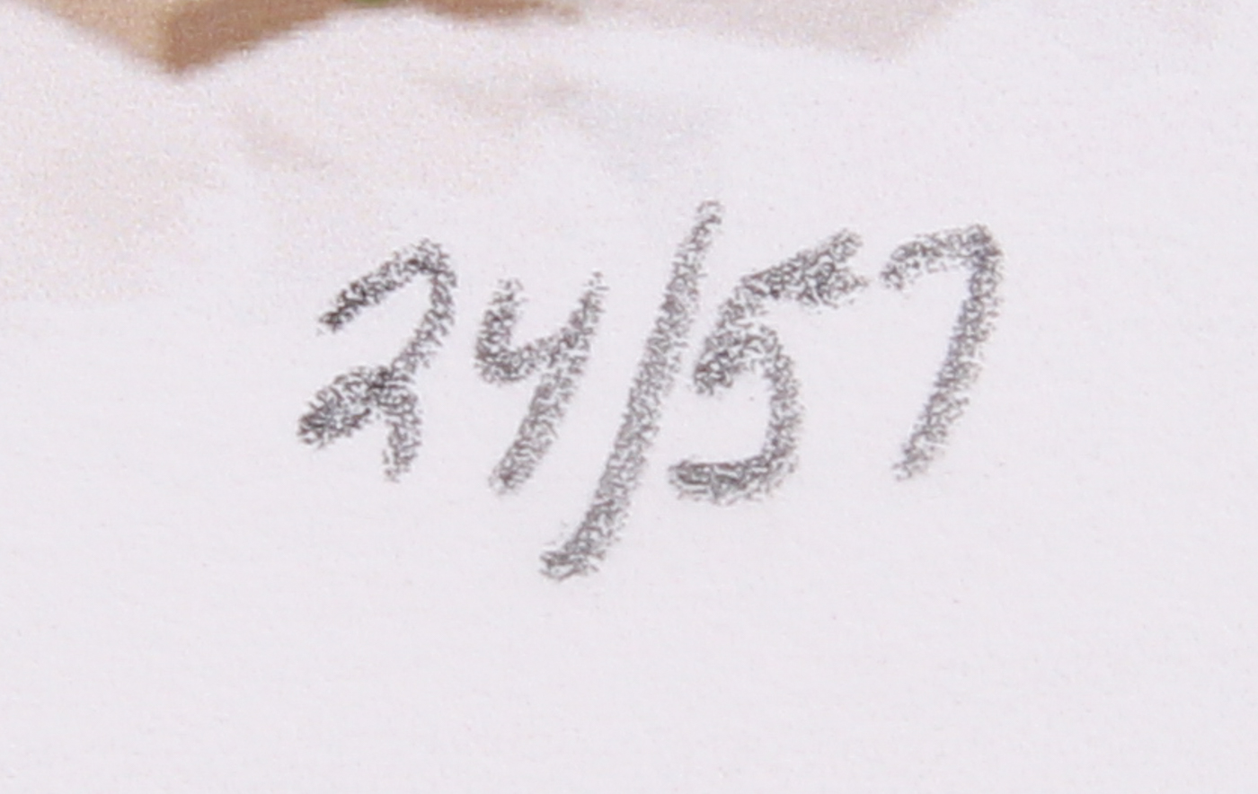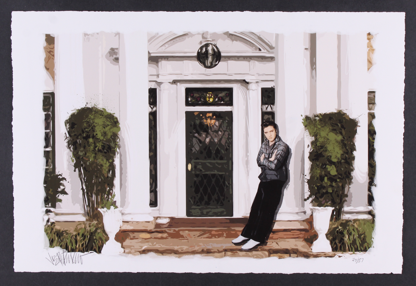 In Joe's own words..."There are often times I look at the house sitting there so big and lonely, and it's kind of sad to me. It was a house filled with song, love, laughter and all of the other things that fill our own homes. I can't help but picture Elvis standing outside the door, just wondering what it would be like to be on the other side of that big wall around Graceland. This painting is how I picture this moment. Is Elvis welcoming us into his house? Or is he welcoming us into the world he created by being so idyllic?" This limited edition on paper by the First Official Artist of Graceland is an edition of only 57 pieces to commemorate 1957 when Elvis Purchased Graceland. It is hand signed by the artist, Joe Petruccio and measures approx 18" x 12" SRP $895. ELVIS™ and ELVIS PRESLEY™ are trademarks of ABG EPE IP LLC Rights of Publicity and Persona Rights: Elvis Presley Enterprises, LLC Artwork ©2015 Joe Petruccio