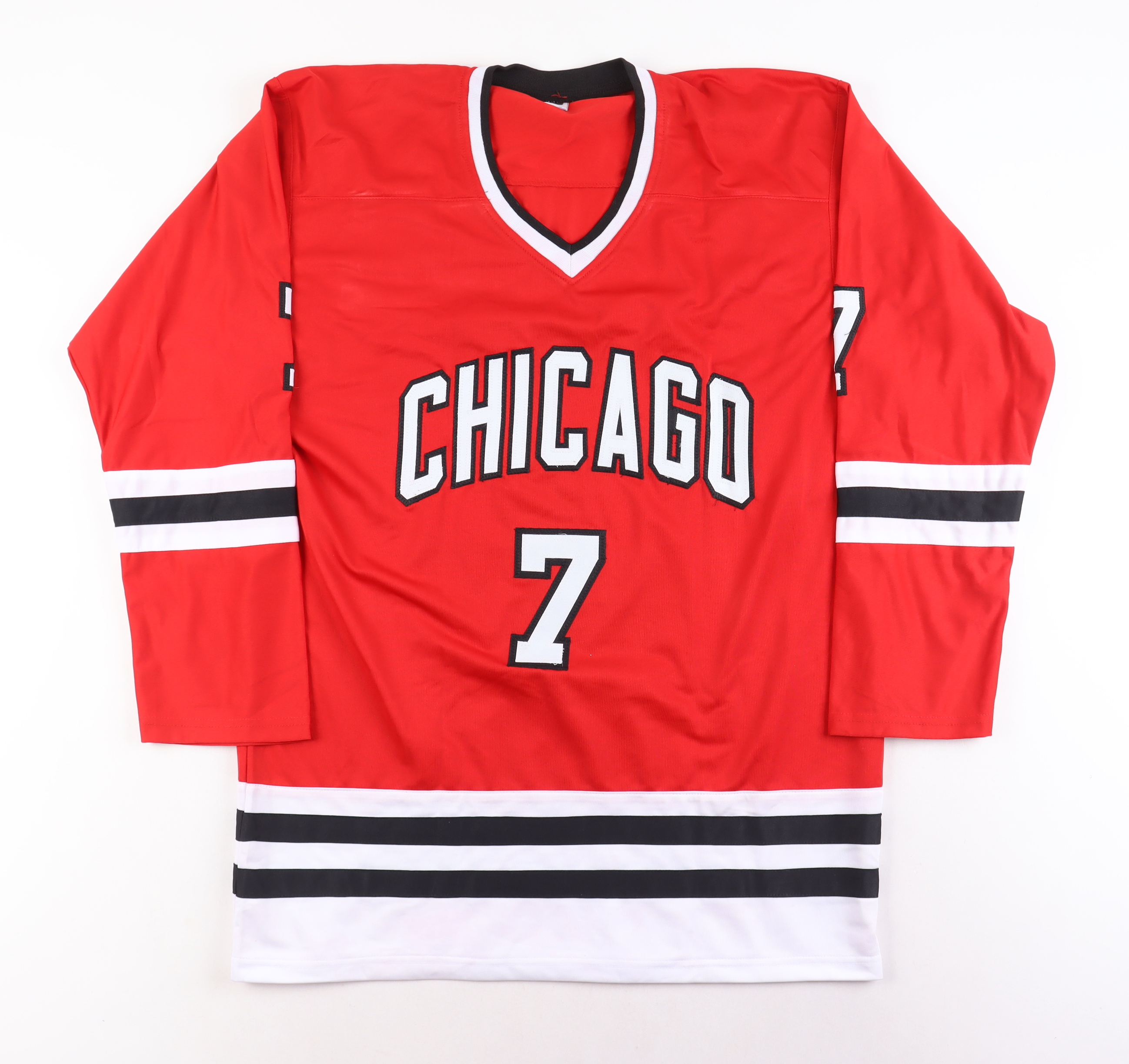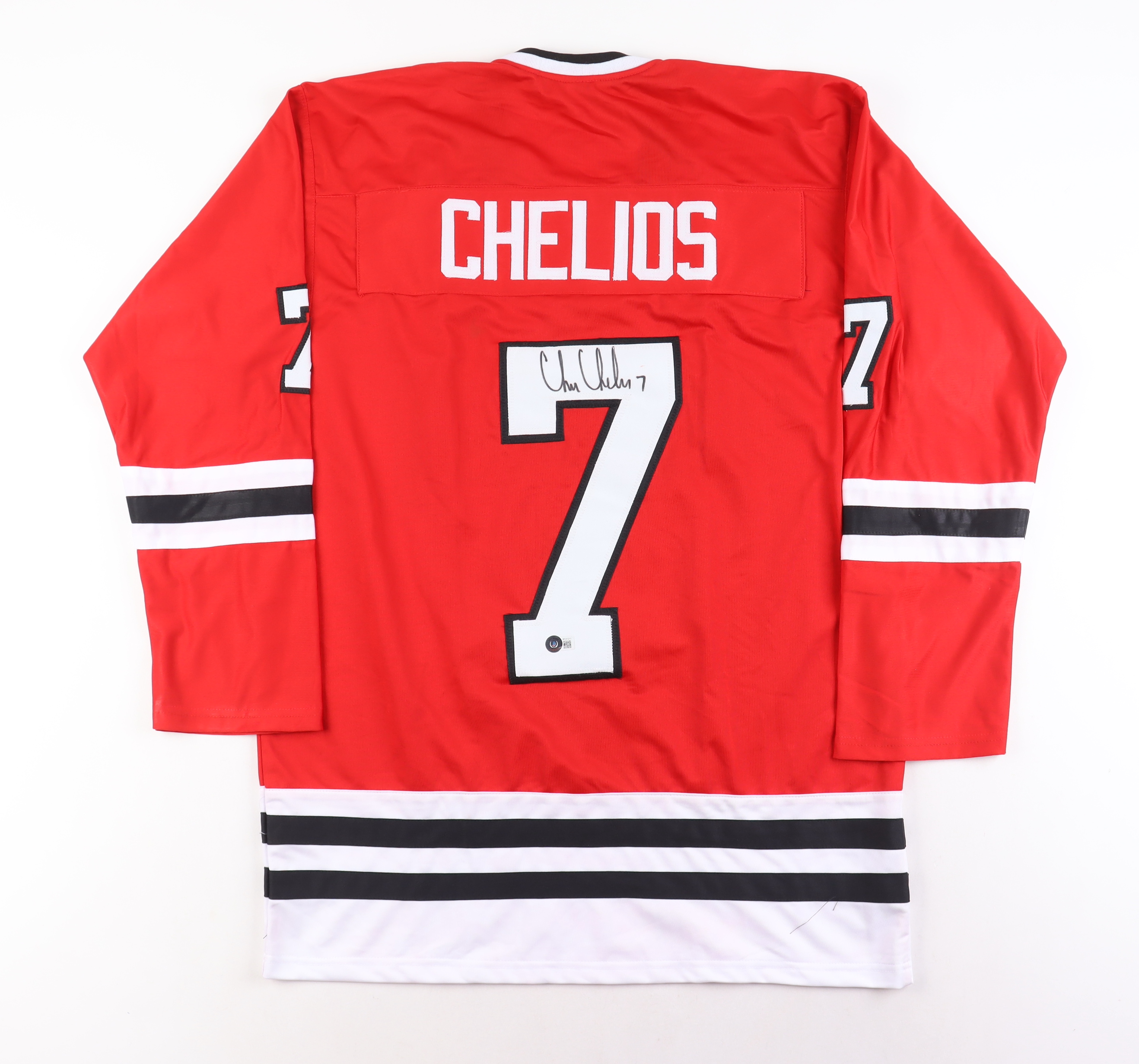 Custom jersey. Everything is sewn on, size XL. Hand-signed by Chris Chelios (HOF).