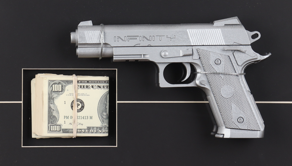 Custom frame measures approximately 17.5" x 29.5" in size and features a Pulp Fiction poster as well as a prop money stack and prop pistol. Please note display is unsigned.