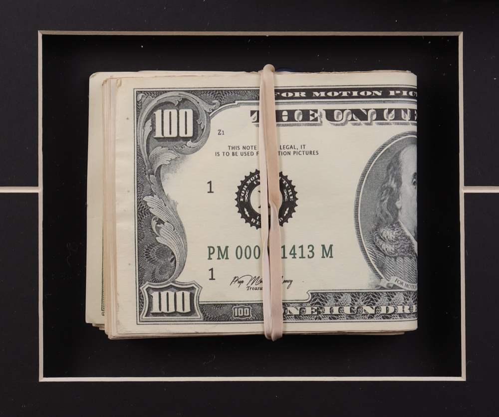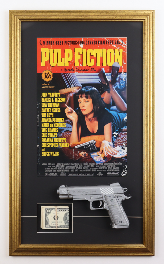 Custom frame measures approximately 17.5" x 29.5" in size and features a Pulp Fiction poster as well as a prop money stack and prop pistol. Please note display is unsigned.