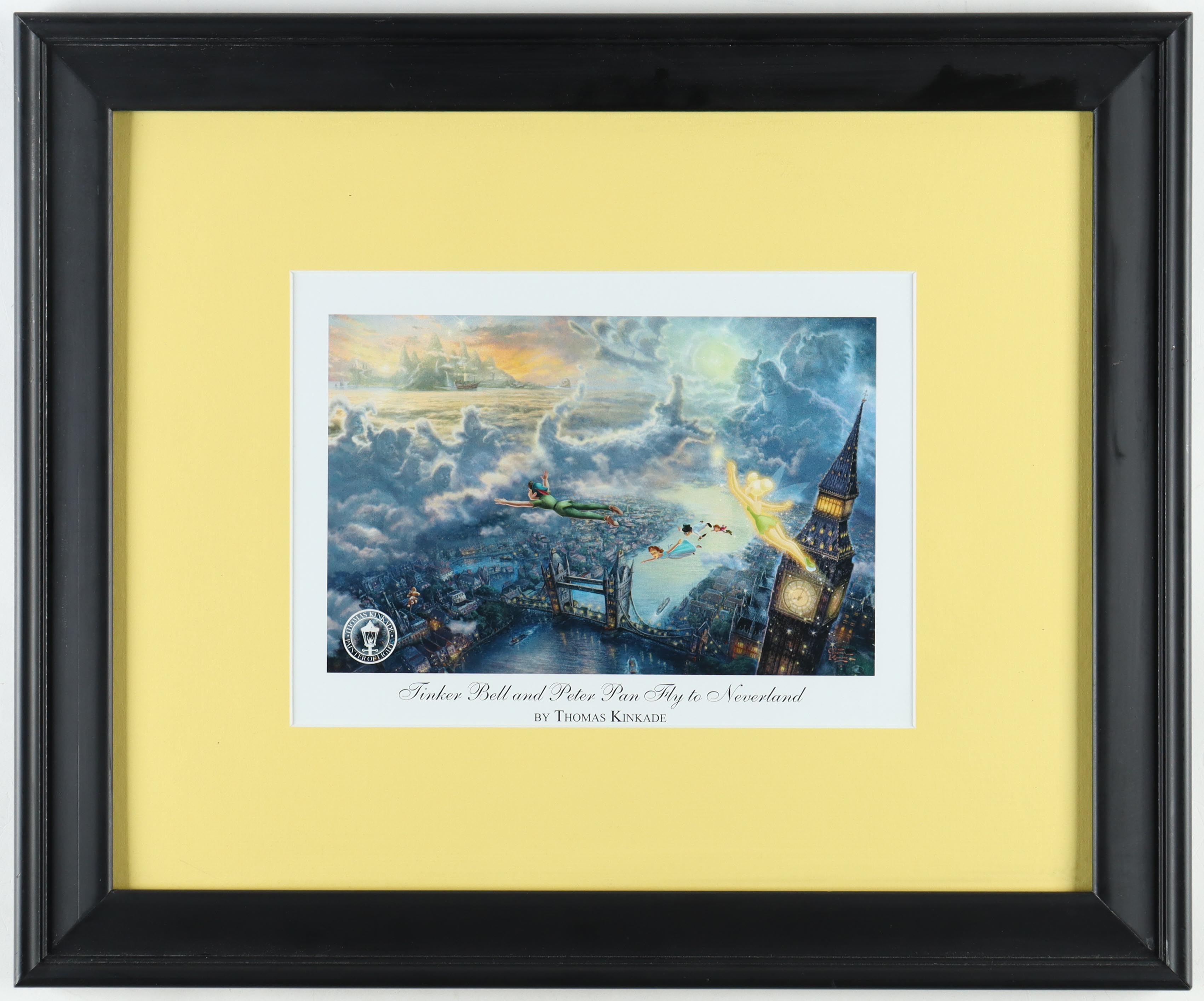 Custom frame measures approximately 19.5" x 23.5" in size and features a print of "Tinker Bell & Peter Pan Fly To Neverland" by Thomas Kinkade (D. 2012). Please note, the display is unsigned and there is scuffing on the frame borders.