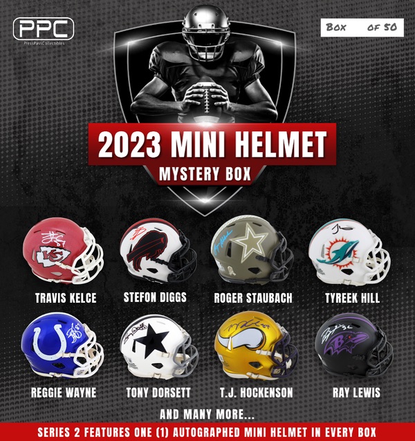 The Press Pass Collectibles 2023 mystery mini helmet mystery box includes one (1) mini helmet from your favorite NFL teams. Some boxes will feature mini helmets signed Reggie Wayne, Tony Dorsett, T.J. Hockenson, Ray Lewis, and many more!