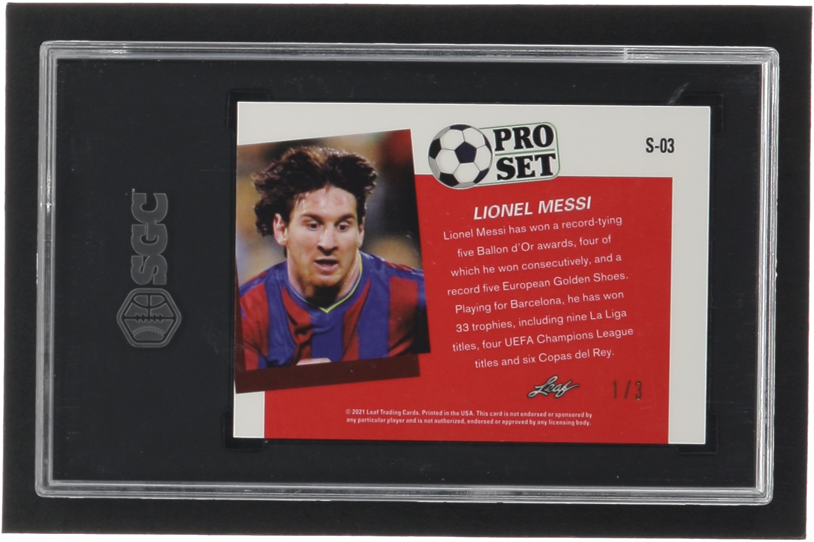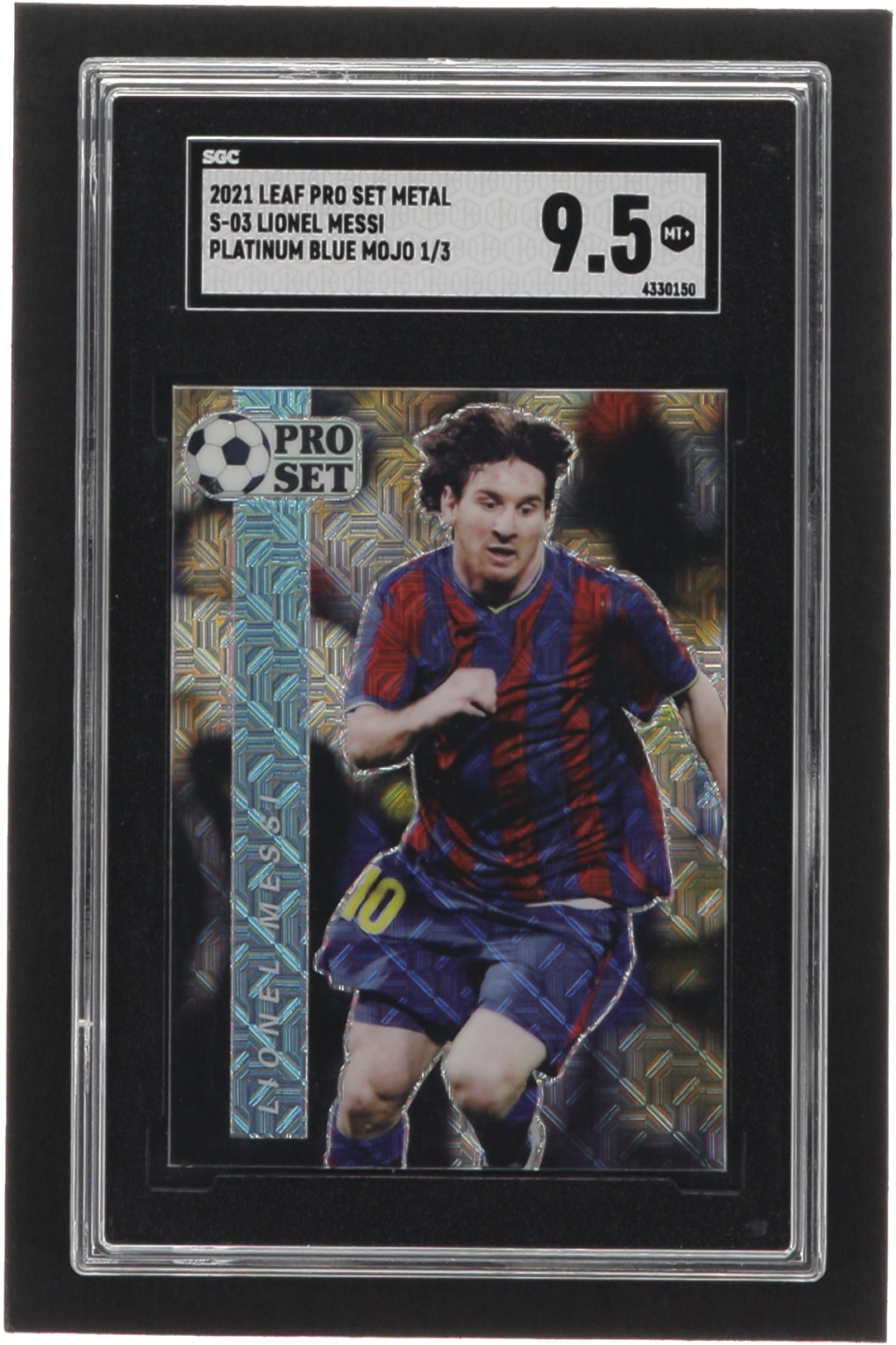 Lionel Messi 2021 Leaf Pro Set Metal Platinum Blue Mojo #S03 #1/3 (SGC 9.5)