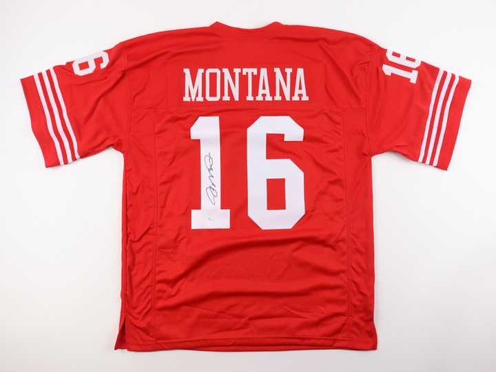 Custom jersey with everything sewn on, size XL. Hand-signed by Joe Montana (HOF). Please note, there are stains on the right sleeve and the signature has bled.