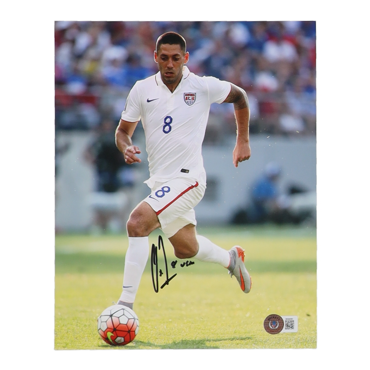 Photo measures 8" x 10" in size and has been hand-signed and inscribed by Clint Dempsey.